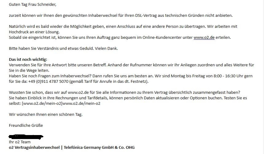 Ich schicke eine Beschwerde, nachdem ich schon mehrfach mit dem Kundenservice telefoniert und den o2 Shop aufgesucht habe und erhalte als Antwort, dass es aktuell möglich ist einen Vertragsinhaberwechsel im DSL-Bereich durchzuführen.