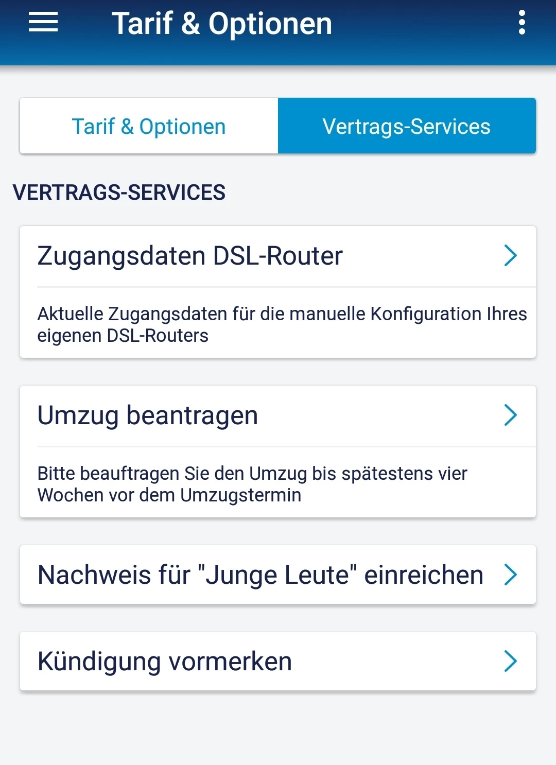 Mein O2 > Tarif & Optionen > Vertrag verwalten