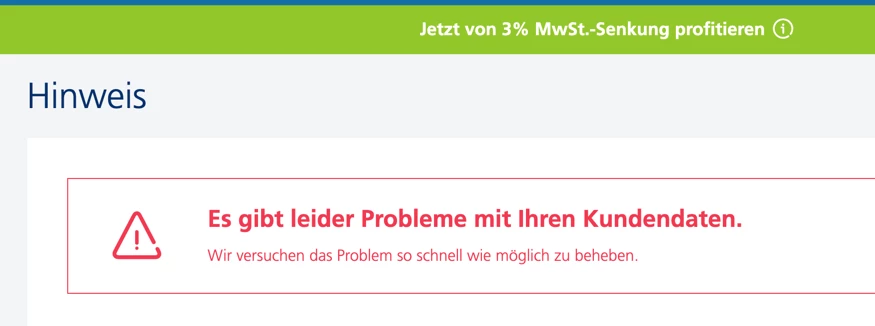 Nachdem ich dem Angebot der Hotline unzufrieden war, wollte ich mir online ein Angebot für die Vertragsverlängerung machen lassen. Aber es kommt die Fehlermeldung “Es gibt leider Probleme mit Ihren Kundendaten”. Und dies seit Tagen und reproduzierbar. Kann jemand helfen? Danke.