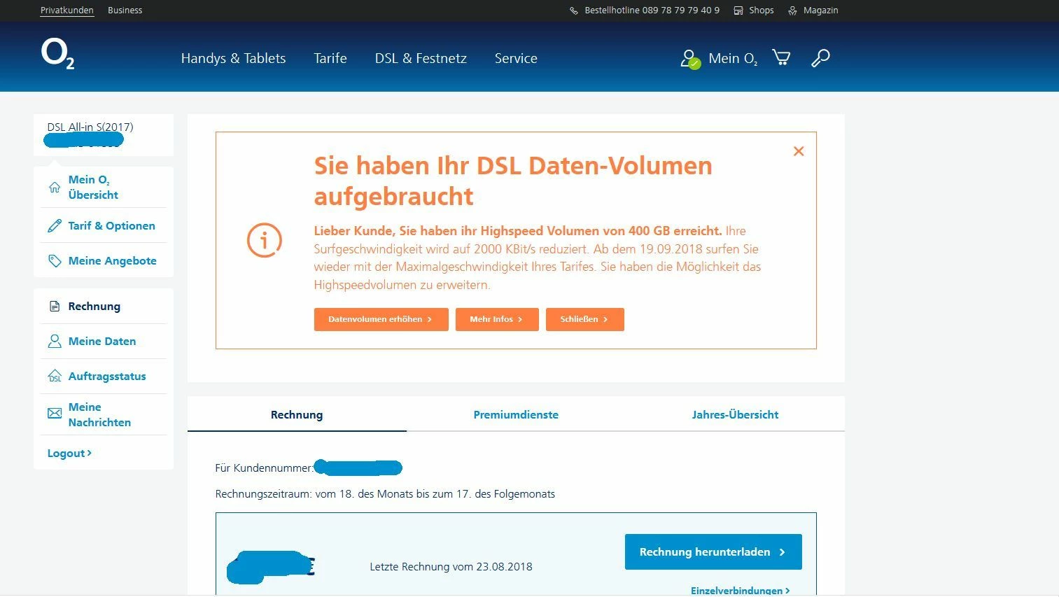 Als ich eben die DSL-Rechnung meines Tarifs o2 DSL S anschauen wollte, knallte es mir rot entgegen: