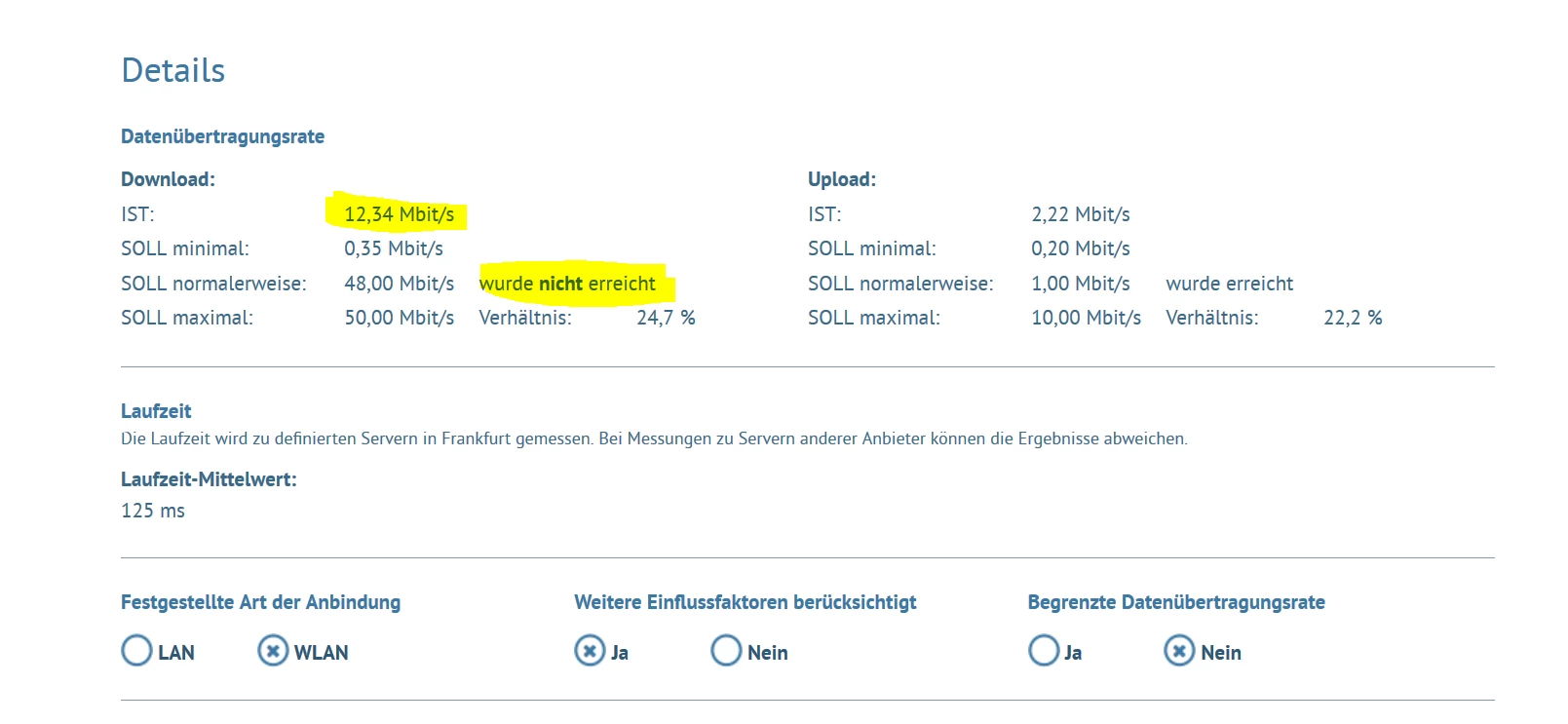 Somit müsste mit Laut Vertrag und Verfügbarkeit eine Leitung mit 50 mbit/s zustehen, doch dies ist nicht der Fall: