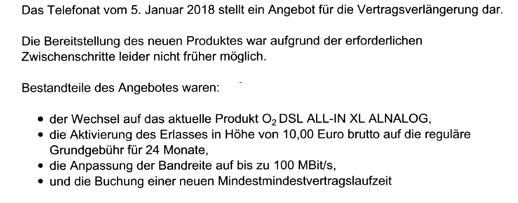 Nach dem Telefonat wurde die Verlängerung mit vereinbarten Konditionen (Erlass auf L) per E-Mail bestätigt. Die Bandbreite wurde leider nicht bestätigt aber das Gespräch wurde aufgezeichnet.