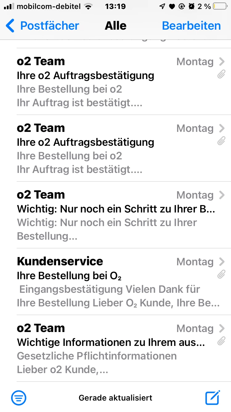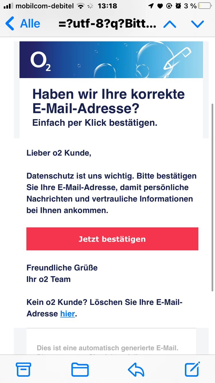 da ich mir am Montag mir ein Handy bestellt habe und der Auftrag wurde bestätigt und Heute Karm eine email das ich meine email Bestätigen soll und wenn ich mich auf der Webseite bei o2 oder bei der App anmelden will um meine email zu bestätigen kommt immer dieser Hinweis : Hinweis allgemeiner Fehler ist aufgetreten Versuchen sie es später nochmal