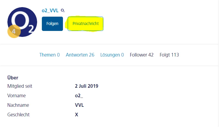 Einfach @o2_VVL anklicken und dann Privatnachricht auswählen.