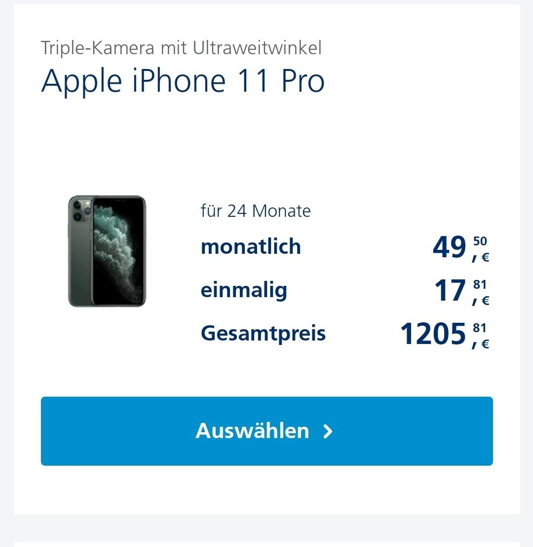 ich hätte gerne ein Angebot mit einem iPhone 11 Pro und einem Vertrag mit mindestens 30GB für maximal 50€ im Monat.