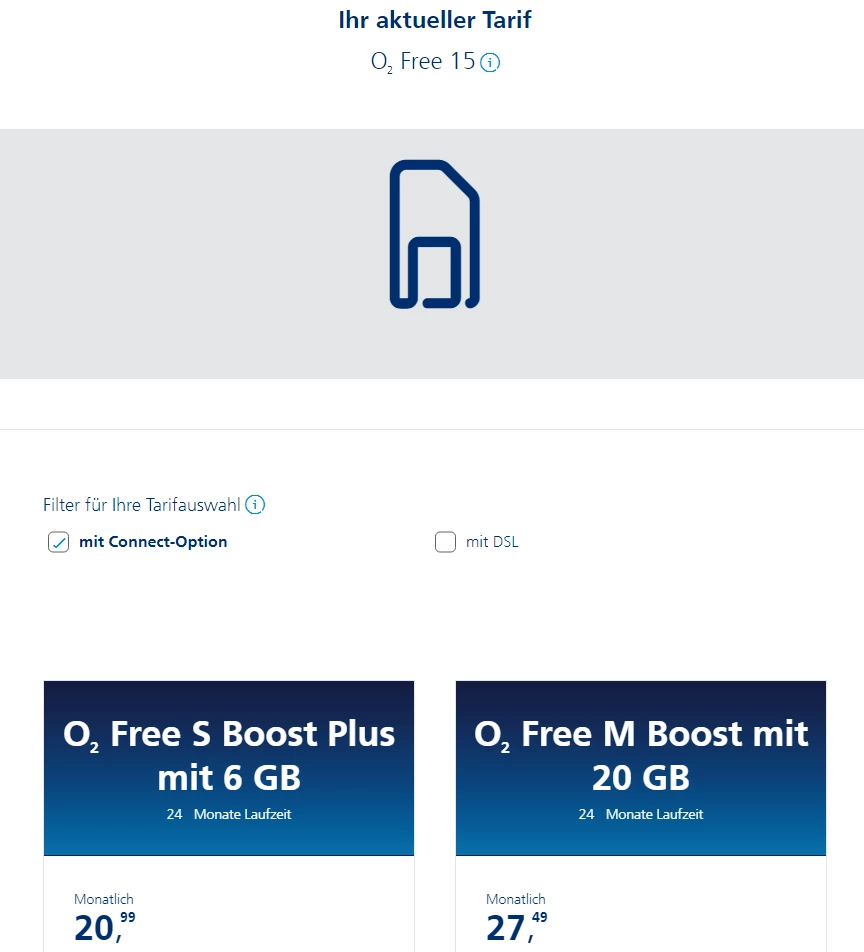 Den o2 Free S Boost Plus kann ich nur mit 6 GB anbieten, ein Volumen von 8 GB ist nicht möglich.