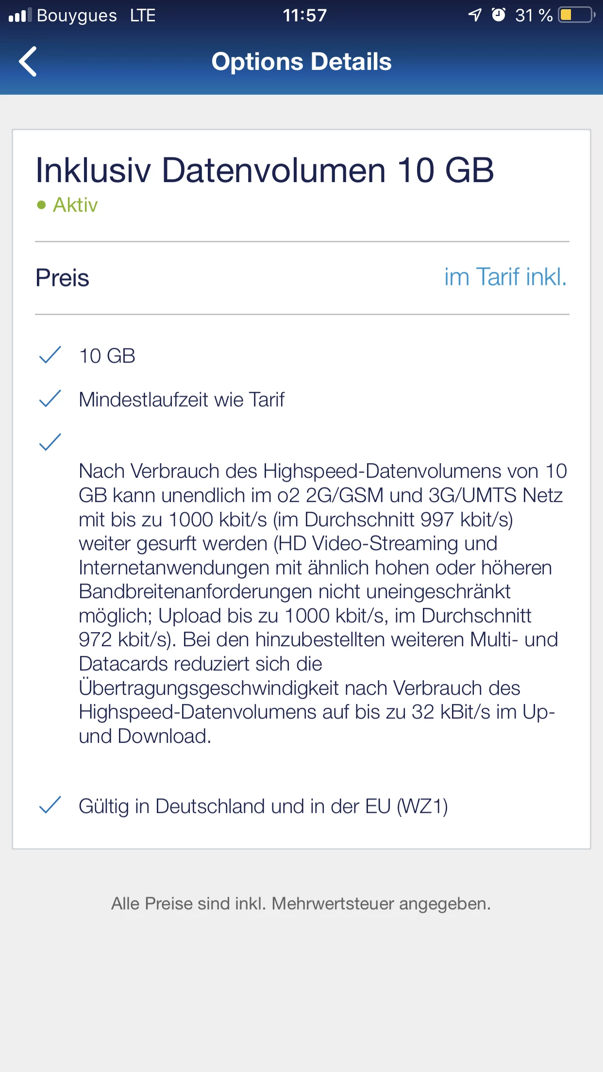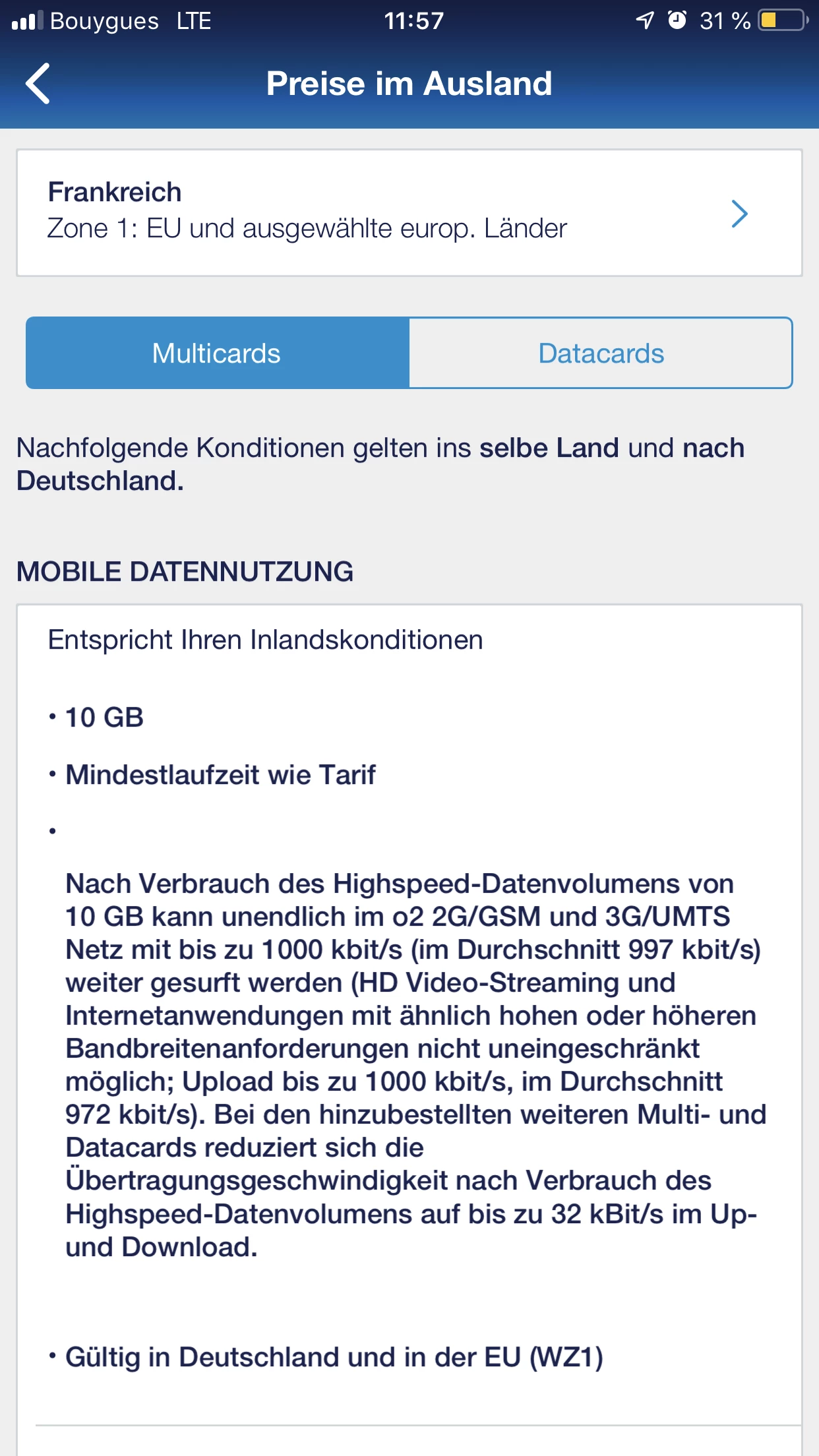 Entschuldige, hätte ich gleich noch fragen sollen: Welche Auslandsoption ist unter Mein o2 eingestellt? Ist dein Inlandsdatenvolumen aufgebraucht?