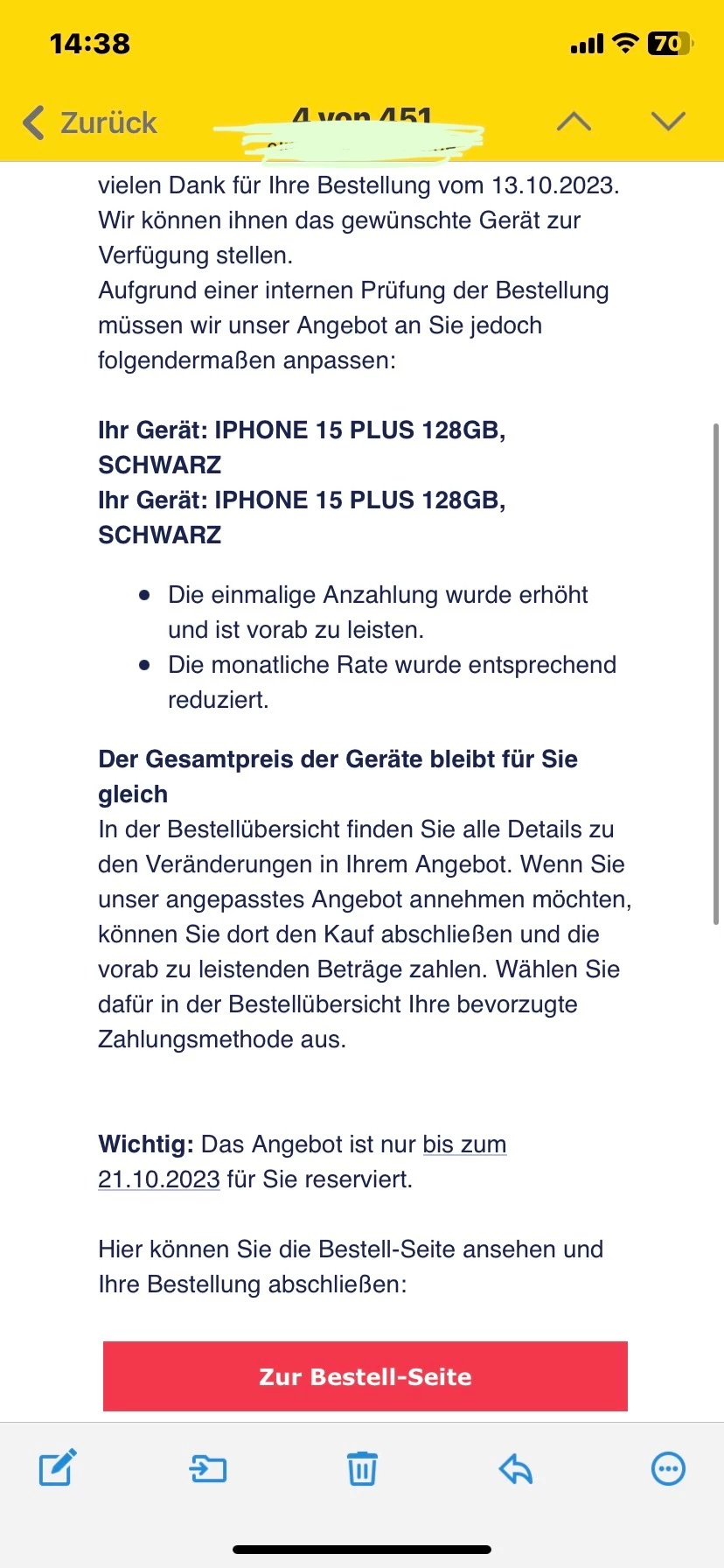 in der Mail siehst du das Datum, bis wann das Angebot gültig ist. In deinem Fall ist das der 21.10.2023. Danach verfällt das Angebot automatisch.
