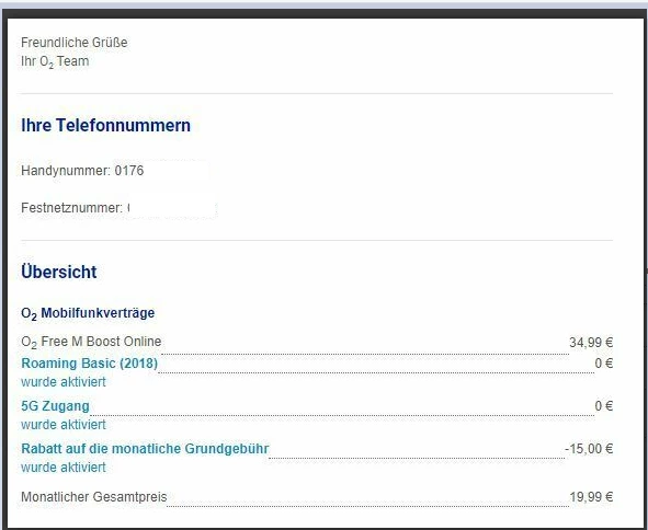Dann ist mir aufgefallen das ich mit dem alten Tarif 35€-15€ Rabatt auf 20€ komme und somit billiger dran bin, dazu hatte der Vertrag 40 GB Internetguthaben und einen 5G-Zugang.