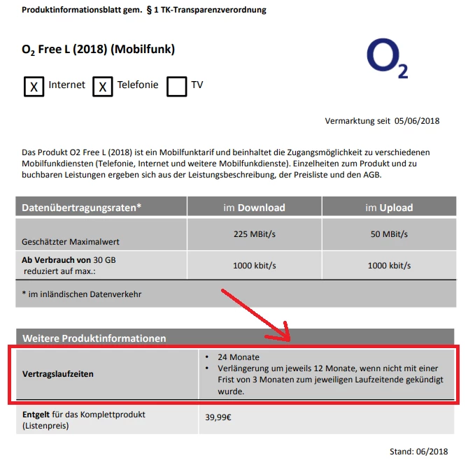 The o2 Free L (2018) product information sheet (without flex)