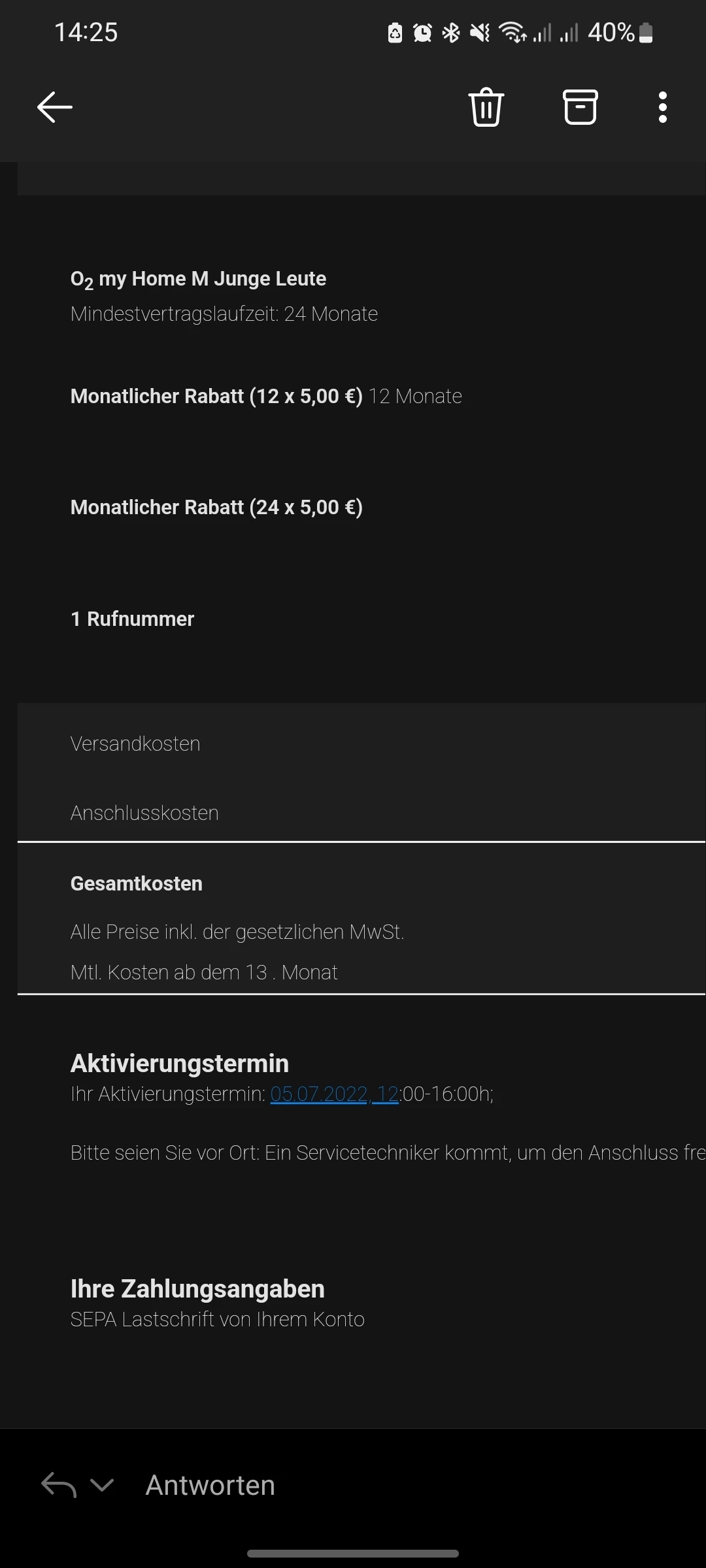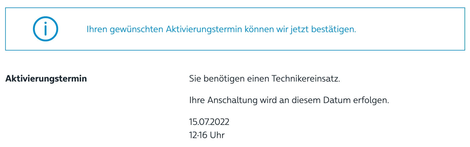 Dann habe ich online nachgeschaut, ob ich bezüglich des Aktivierungstermins noch weitere Informationen finde. Und was sehe ich da, mein Wunschdatum für den Aktivierungstermin wurde auf den 15.07.2022 geändert.
