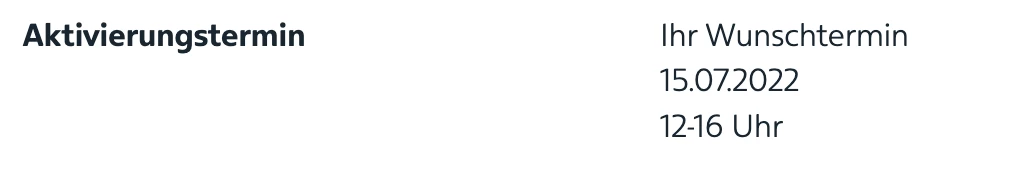 Heute habe ich eine SMS erhalten, dass ich ab 15.07.2022 mein Produkt nutzen kann. Bei Online-Vertragsabschluss habe ich als Aktivierungstermin den 05.07.2022 ausgewählt (siehe Bild):