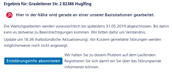 Laut Livecheck sind gerade Wartungsarbeiten an der Station "Grasleitener Str. 2 82386 Huglfing". Die Arbeiten an der Station sollen am Freitag beendet sein. Für mich sieht das so aus, als würde an der Station gerade der LTE Ausbau laufen. Ich befürchte allerdings, dass LTE Ausbau in Huglefing nichts am Empfang in Eglfing verändern wird... denn die Entfernung beträgt gut vier Kilometer, und das ist zu weit für guten Indoorempfang.