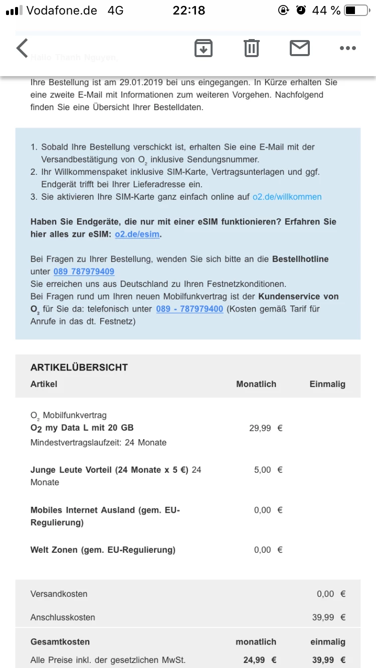 Ich habe einen Tarifvertrag für junge Leute online bestellt und habe danach einen Brief bekommen dass ich erfolgreich einen Tarifvertrag für junge Leute mit dem Angebot 24,99 gemacht habe. Aber es steht jetzt keinen Vorteil in meiner Rechnung. Was kann ich nun machen? Was ist passiert wenn ich einen Kündigungsfrist mache? Denn mein Vertrag ist am 1.2.2019 aktiviert. Danke im Voraus!