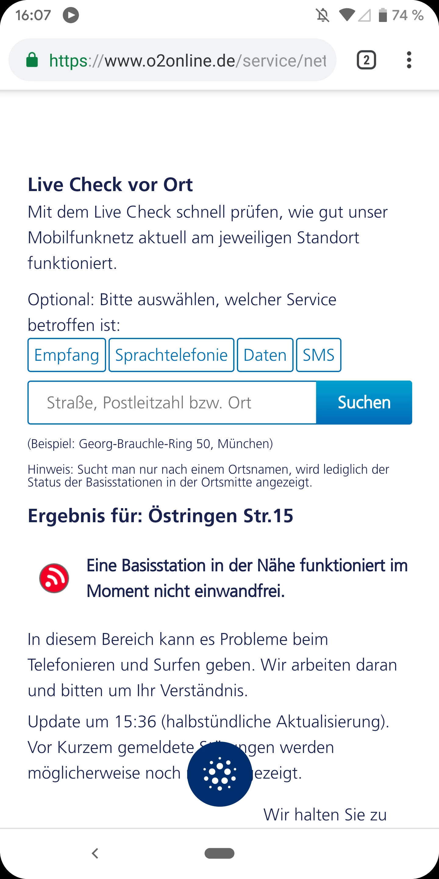 vielen Dank für die Meldung. Aktuell ist unter der Adresse eine 3G und 4G Basisstation defekt, daher verbindet sich dein Gerät aktuell dort mit dem 2G-Netz. Leider habe ich hier noch keine Informationen vorliegen zu wann diese behoben sein werden.