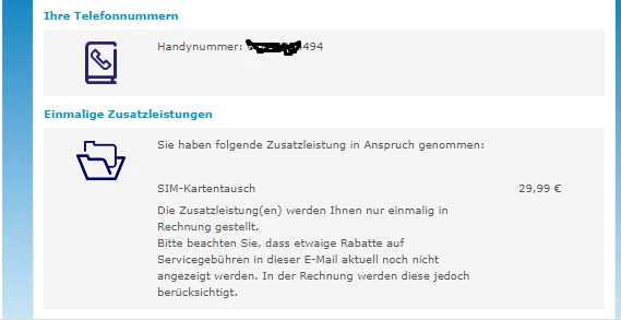 Bitte warte einmal, bis du eine Berechnung des SIM-Karten-Tausches auf deiner Rechnung siehst. Dann melde dich gerne hier über diesen Kanal zur Erstattung der berechneten Gebühr.
