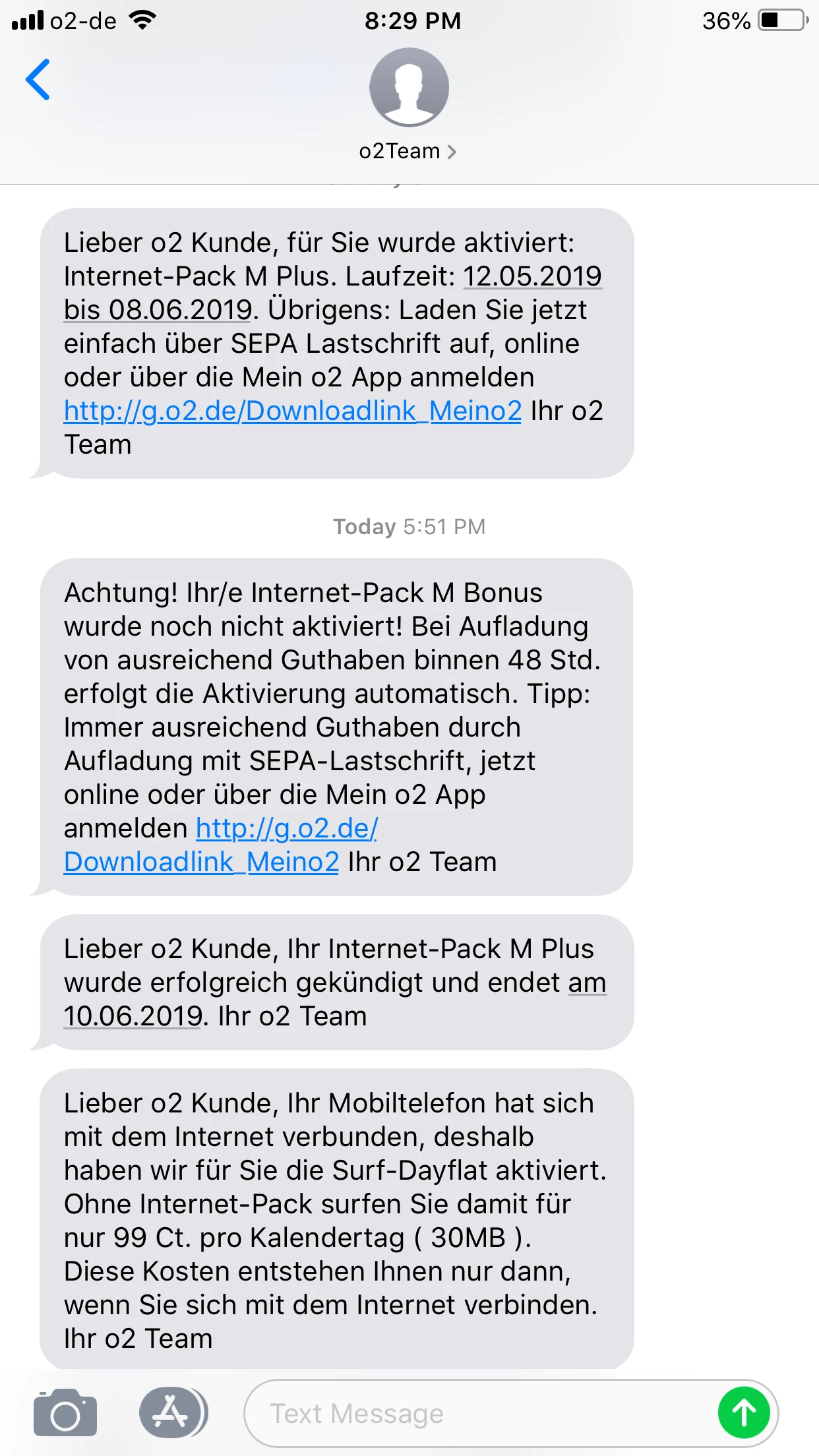 Am 12.05.2019 hast du das Internet Pack M Plus bestellt und dieses am 16.05.2019 um 18:14 Uhr abbestellt.