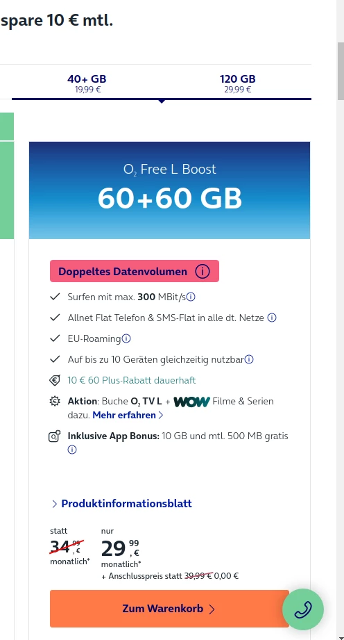 ich bin bei diesem Angebot - s. Screenshot - unsicher, was ich am Ende bezahle, weil im Produktinformationsblatt dann noch ein Preis - 44,99 Euro monatlich genannt wird. Verstehe ich es richtig, dass ein Kunde, der/die über 60 ist, zahlt dann monatlich 29,99 beim monatlichen Datenvolumen 120 GB?