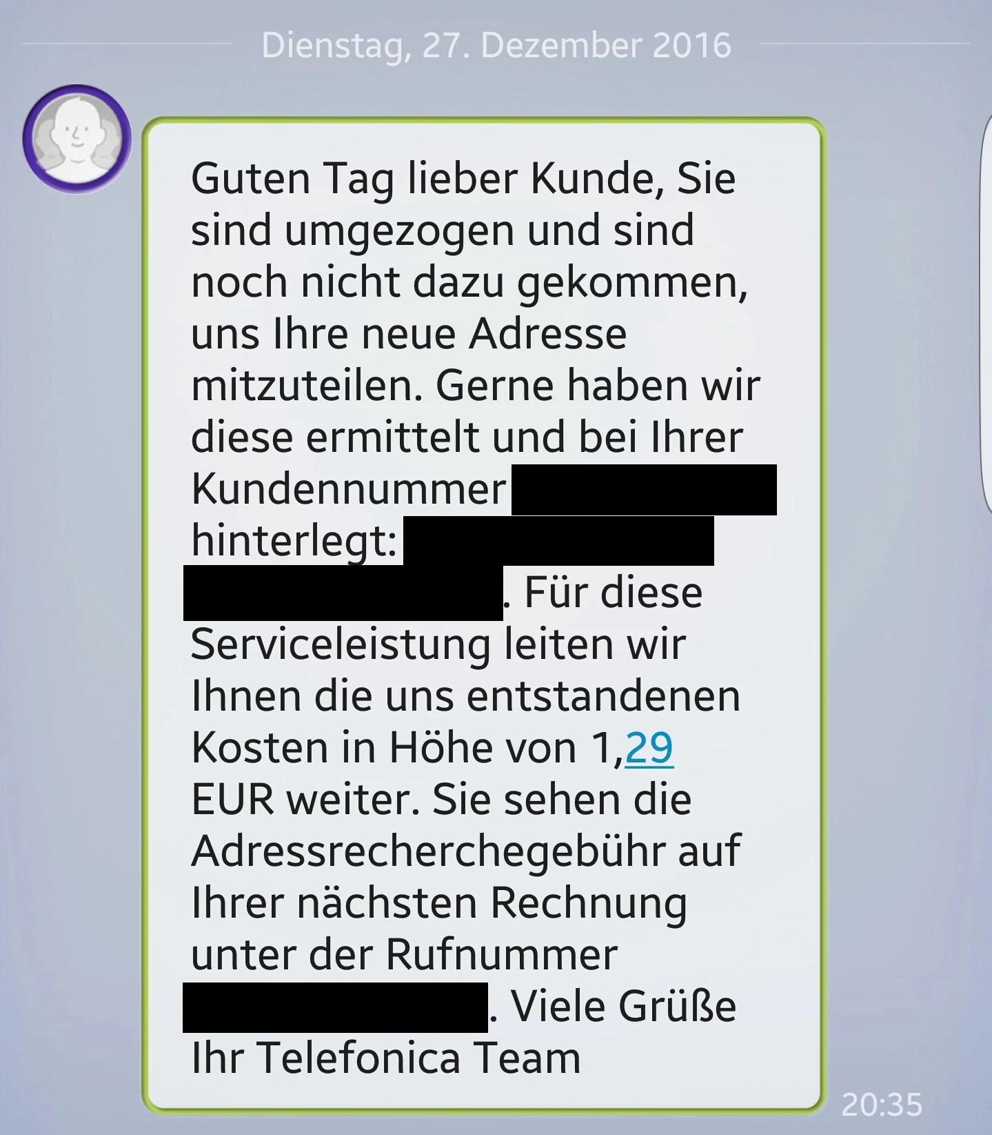 Ich habe heute eine einfache Ankündigung per SMS bekommen, dass meine neue Adresse ermittelt wurde und das dafür eine Gebühr von 1,29€ fällig wäre. Ich finde dieses Vorgehen absolut dreist, da ich erst ab Oktober dort offiziell wohnen werde und die Adressänderung zusätzlich über die Deutsche Post über den Nachsendeauftrag weitergegeben wird. Da ich aber keine Briefe per Post von O2 bekommen habe, ich noch nicht umgemeldet bin und die alte Adresse bis 30.09.2016 noch vollständig gültig ist, wundere ich mich wie Sie an die Information kommen, das ich umgezogen bin. Eine Meldung meinerseits wäre rechtzeitig am 01.10.2016 erfolgt.