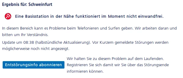 Gerade in Schweinfurt sind leider noch die bereits erwähnten Störungen vorhanden. Diese beschränken sich nicht nur auf LTE, sondern betreffen auch UMTS.