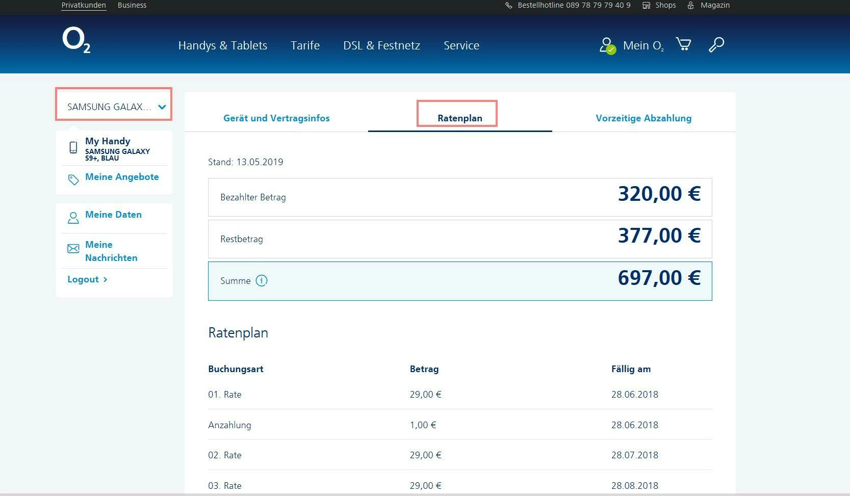 Wenn du gleichzeitig einen Tarif abgeschlossen hast, solltest du den Ratenplan auch in "mein o2" einsehen können, sofern du dich für "mein o2" registriert hast.