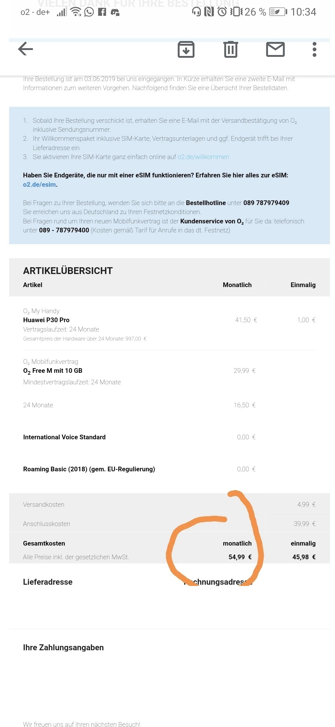 Die Gesamtsumme aus Mobilfunkvertrag und Handykauf liegt also bei den oben geschriebenen 54,99€.