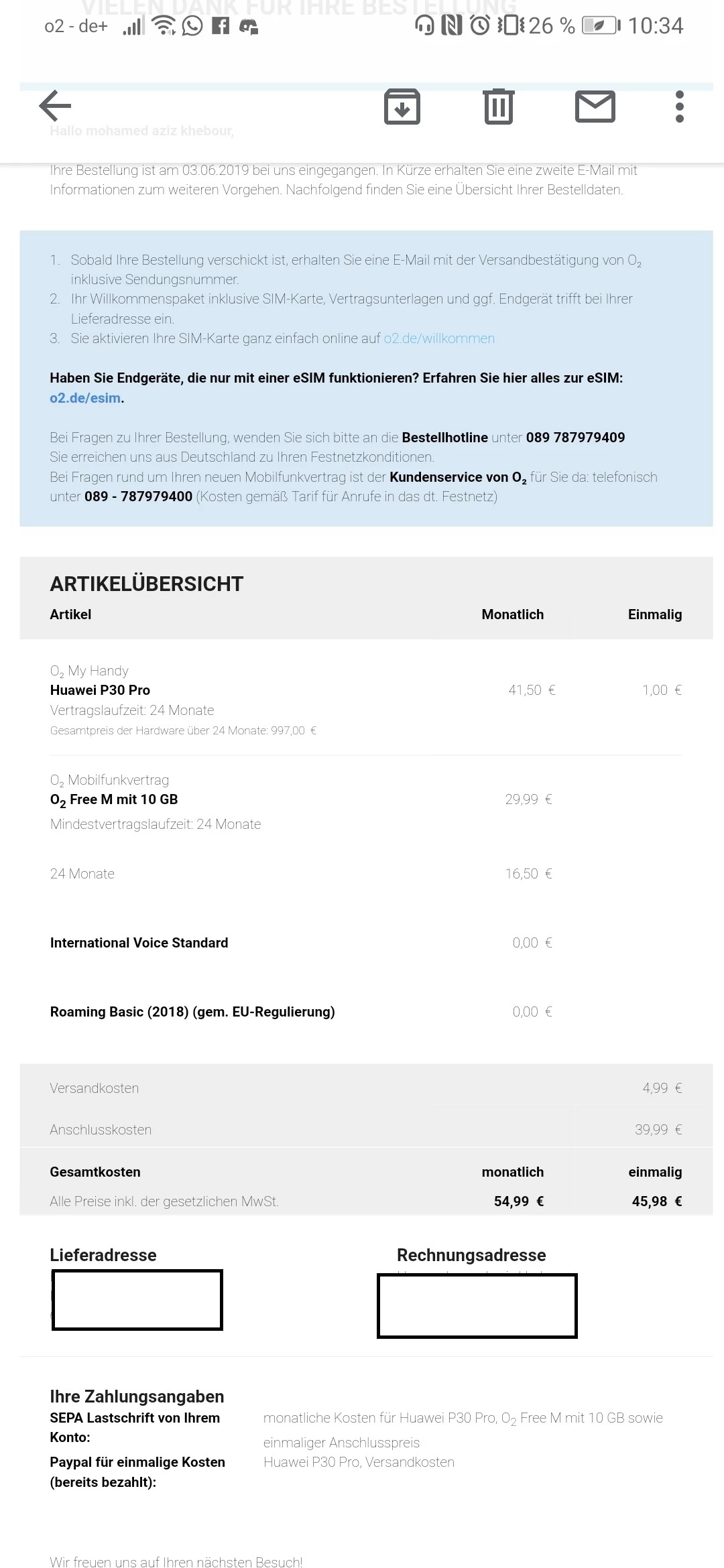 hallo ich habe ein vertrag fur ei. p30 pro und 10 gb internet gemacht. Normalerweise ich zahle jeder monat 59.9 euro fur das handy und fur die 10 gb zusammen denn dad handy kostet 41,5 euro monatlich aber in jeder monat ich bekomme eine Rechnung fur 55.90 und ein andere furr 41.5 eurro so ich glaube es gibt ein fehler bitte hilfe!!!