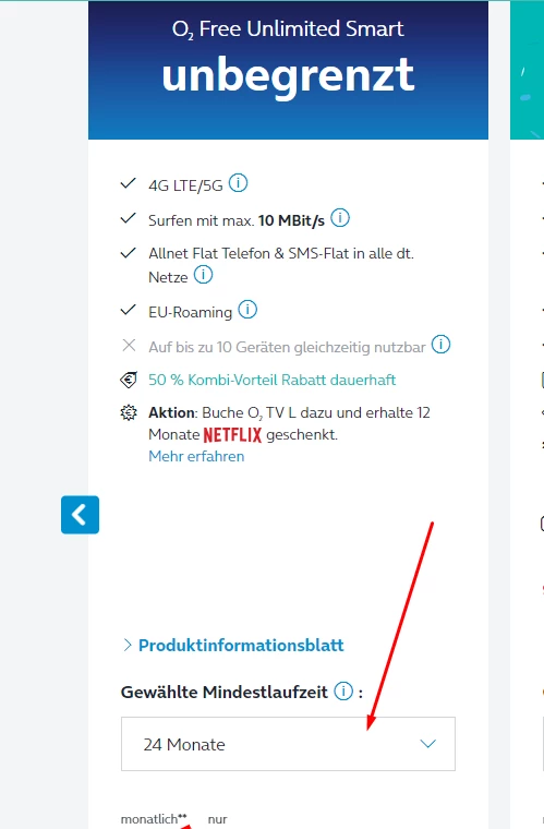 Du kannst bei unseren Tarifen die Mindestlaufzeit direkt auswählen, z.B. bei einem Neuvertragsabschluss. Entweder 24 Monate oder Ohne Laufzeit ( monatlich kündbar ).