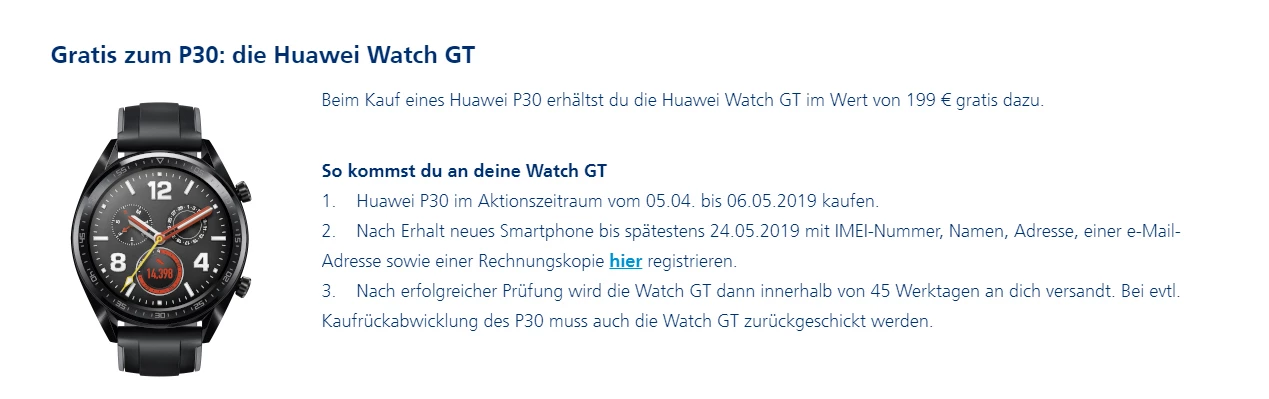 Nun stellt sich mir Frage ob die Huawei watch mit geliefert wird? Diese wird in keiner Vertrags Bestätigung erwähnt. Als ich den vertrag aufgegeben habe wurde sie aber als inkl. Angezeigt und in der Werbung wird sie auch überall erwähnt.
