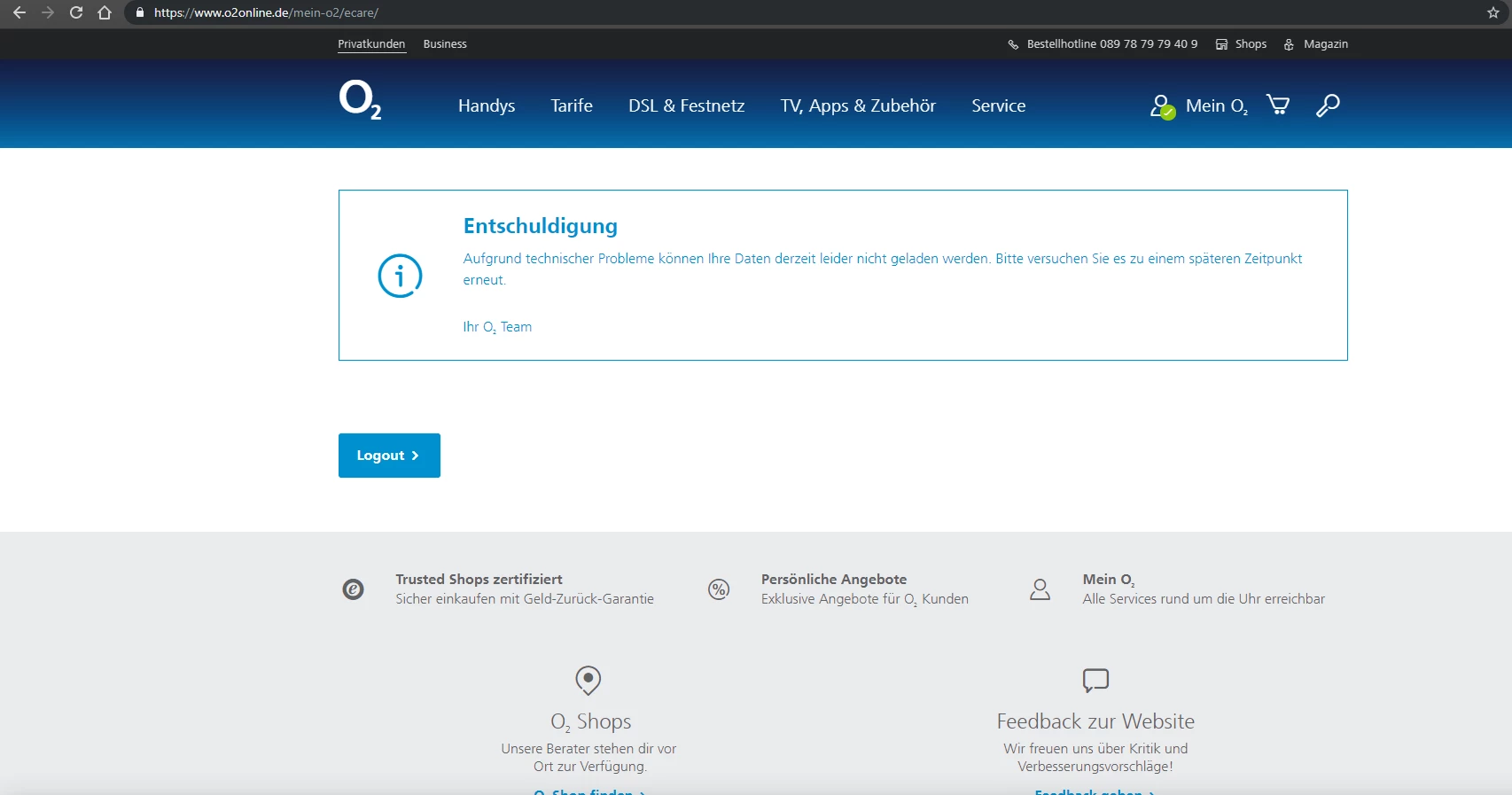 Ich habe neuerdings einen Vertrag mit o2 abgeschlossen und will eine Rufnummernmitnahme beantragen. Soweit ich erfahren habe, muss ich dafür erstmal das "Mein o2" Profil erstellen. Wenn ich jedoch versuche bei dem "Mein o2" Menü auf login zu drücken, werde ich einfach auf https://hilfe.o2online.de (die Seite von der ich versucht habe in das Menü zuzugreifen) geführt, und habe von daher keine Kontrolle über mein o2 Konto. Was könnte ich machen um das Problem zu beheben?