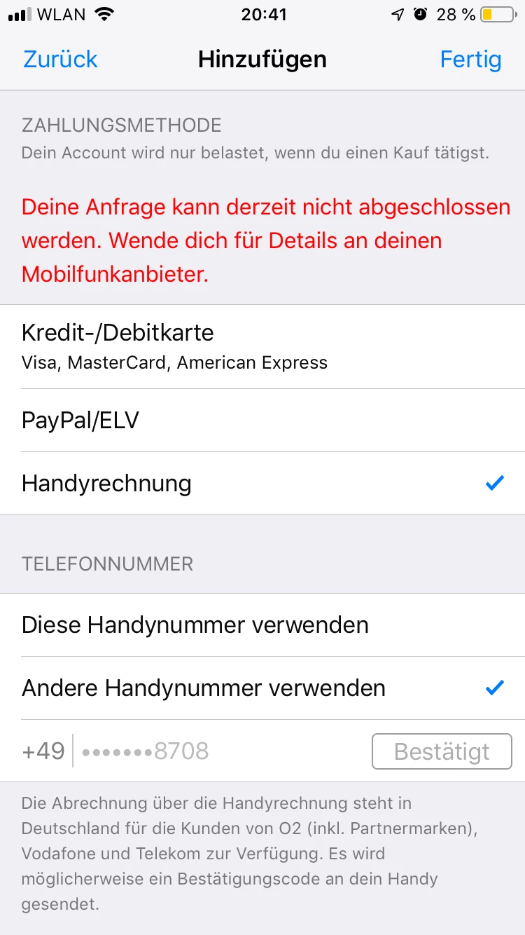 Ich habe mein Guthaben aufgeladen jetzt habe ich 16€ drauf alles schön und gut. Nun wollt ich mit meinem Guthaben etwas kaufen bei einem Spiel auf Appstore über zahlungsdaten und dann über Telefonnumer. Was auch bis jetzt immer funktioniert hat, nur jetzt steht das seit einigen Wochen „Ihre Anfrage kannderzeit nicht abgeschlossen werden melden sie sich an ihren Mobilfunkanbieter.“ Kann mir da jemanden helfen? LG
