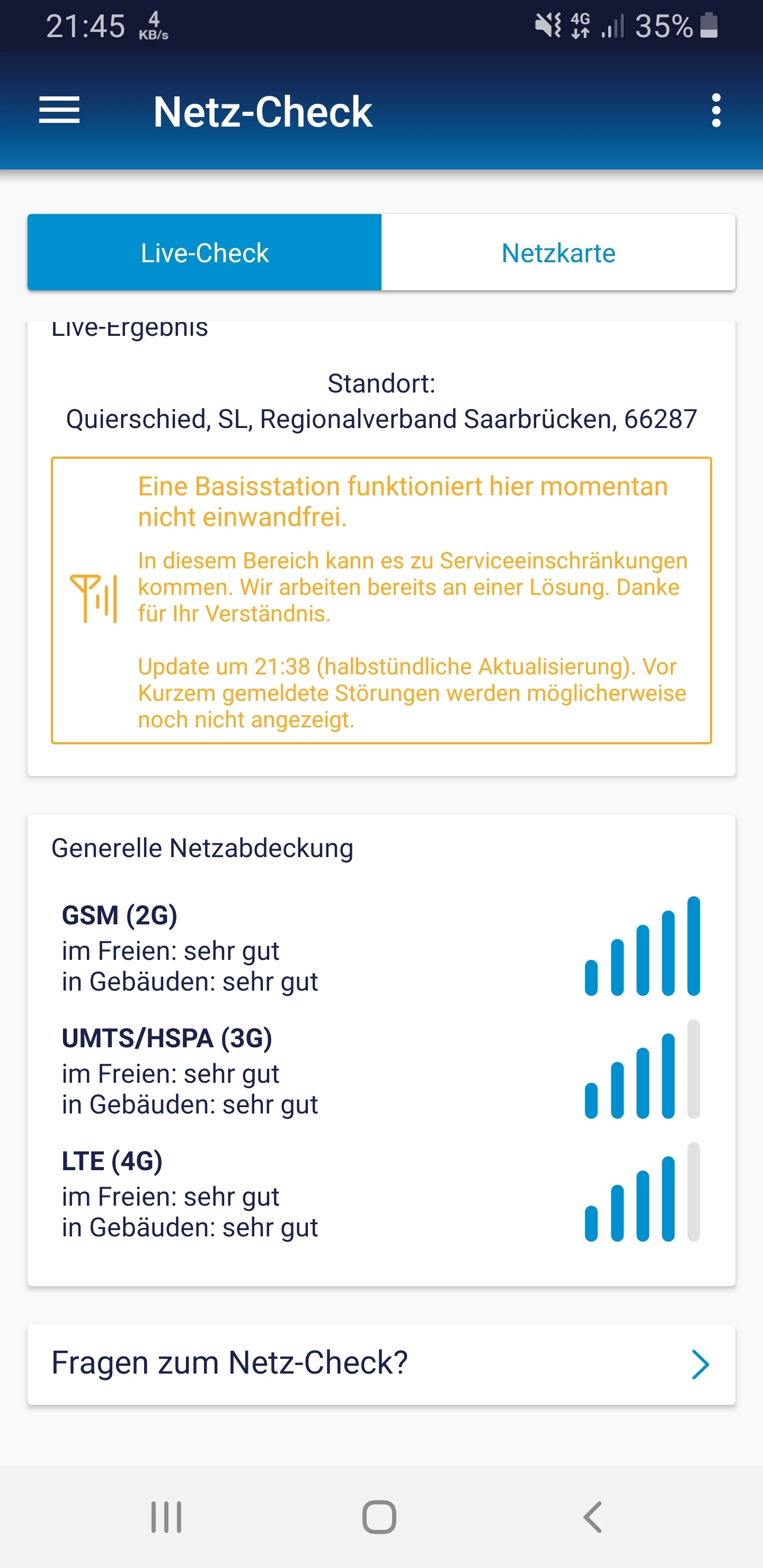 Hallo, also habe hier in meiner Region (66287) wo ich in der Regel im Freien immer 4G hab seit etwa 2 Tagen nur noch 2G bzw. H+ bekomme auch bei manueller Netzsuche kein o2 4G angezeigt!!! ist das Problem bekannt und wird an einer Lösung gearbeitet?