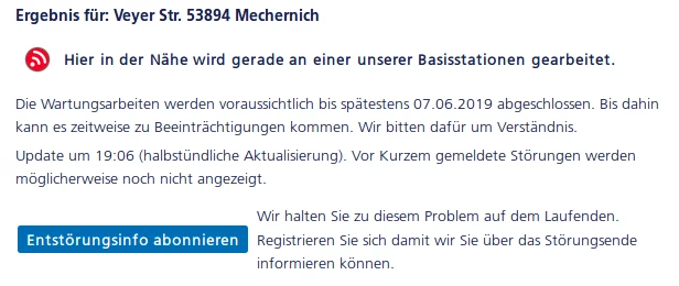 laut Livecheck sind Wartungsarbeiten bis zum 07. Juni angesagt. Das könnte in deinen Fall der LTE Ausbau an der Station "Veyer Str. 53894 Mechernich" sein --> passende Einträge sind vorhanden, und "Wartungsarbeiten" die genau eine Woche dauern, sind eh immer " sehr verdächtig". 😉