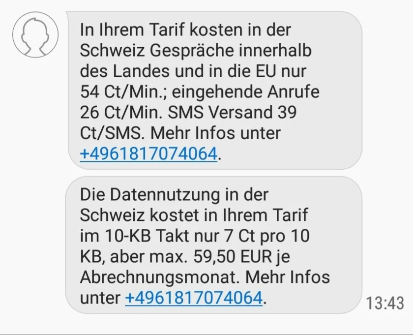 magst du mir hier einen Screenshot von der SMS schicken, die du bekommen hast, als du in die Schweiz gegangen bist? Wir lassen dein Anliegen dann von der Fachabteilung prüfen.