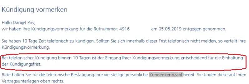 Und auch, wenn dort steht, dass die Vormerkung entscheidend für die 10 Tage ist, ist gesetzlich und rechtlich der Kunde in der Beweispflicht, dass die Kündigung (in Textform) fristgerecht eingegangen ist .