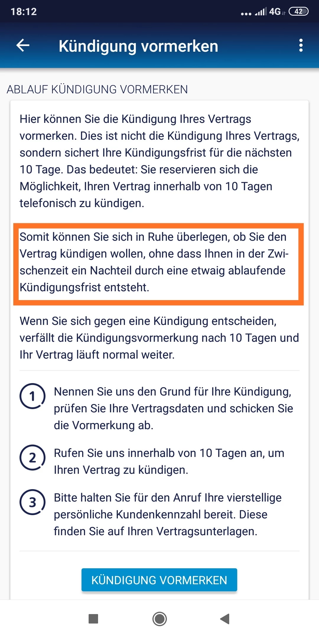 Ich habe fristgerecht am 05.06.2018 meine Kündigung zum 11.09.2019 online vorgemerkt. Danach habe ich am 12.06.2018 die Kündigung telefonisch bestätigt.