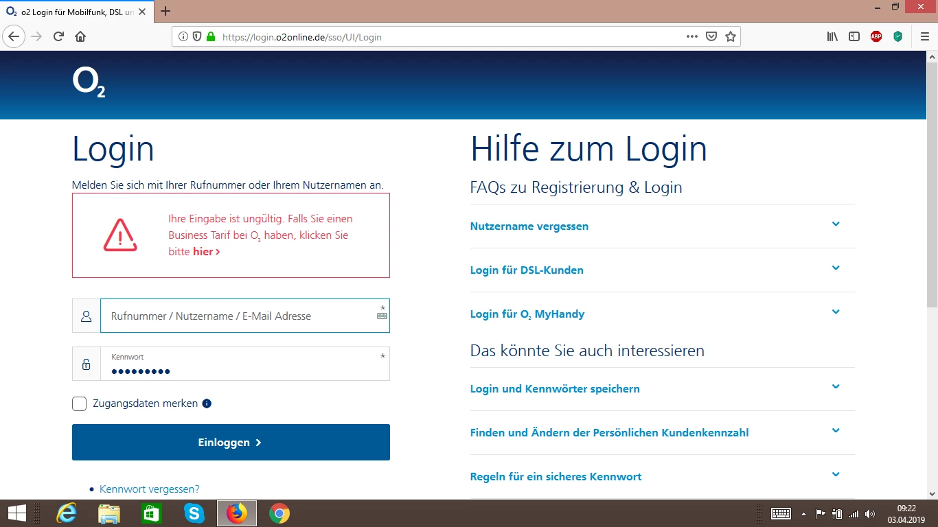 danke für die Antwort und die Entschuldigung. Das Problem beim Login ist recht simpel. Ich versuche mich mit Hilfe meiner Rufnummer und meines Passworts einzuloggen, doch es klappt nicht. Dann lasse ich mir ein vorläufiges Passwort zuschicken, gebe ein neues Passwort ein, doch beim nächsten Versuch mich einzuloggen, kommt wieder die gleiche Fehlermeldung.
