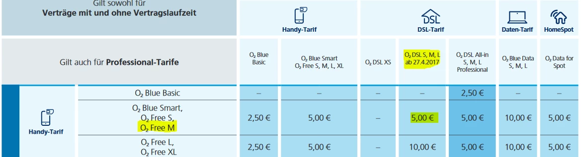 DSL S und o2 Free M, da könnte es 5 EUR kombi-Vorteil geben, wenn es der markierte DSL Tarif ist