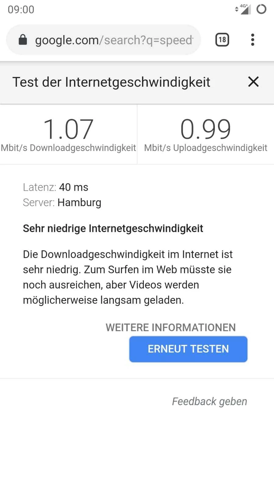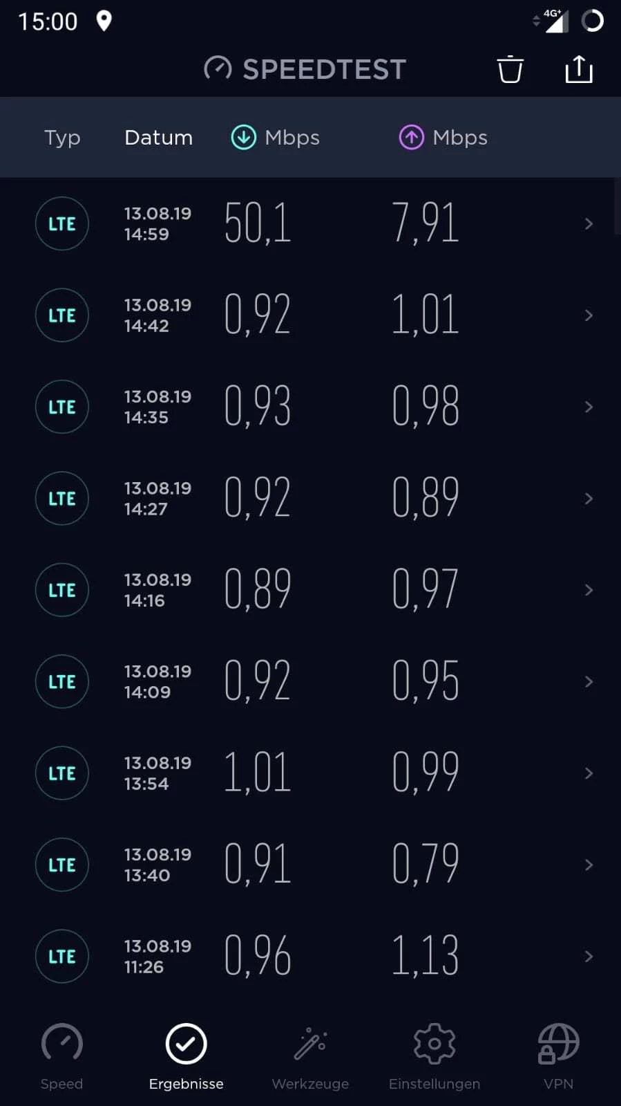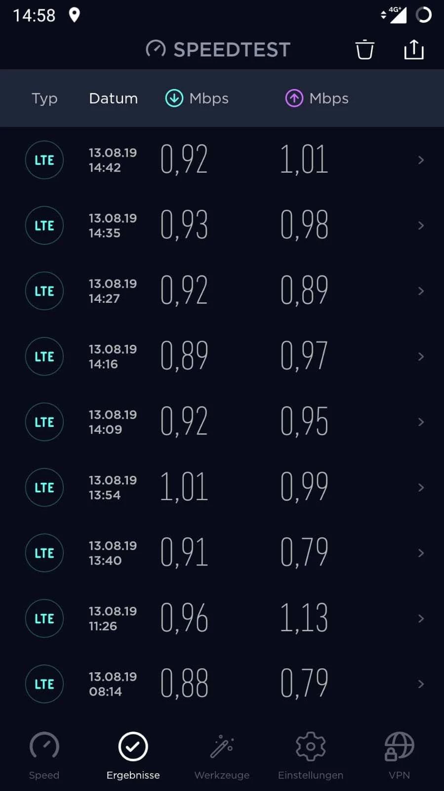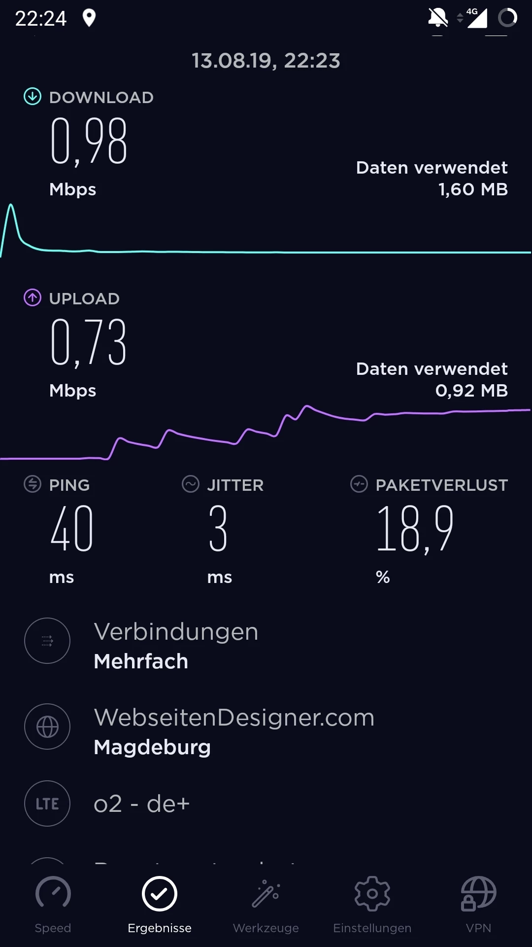 Habe ich getan, keine Veränderung. es pegelt sich bei 0,9 ein. Datenvolumen waren vorher 4 GB. ab 14-15 Uhr habe ich manchmal volle Leistung. Das langsame Internet habe ich an unterschiedlichen Standorten. Ich war schon vor 14.00 Uhr im O2 Shop (vor dem Termin als ich schnelles Internet hatte). Der Mitarbeiter vor Ort hat die geringe Datenleistung gesehen und meinte, dass es wie eine Drosselung scheint. Ich kann aber nicht jeden Tag in den Laden gehen. Speedtest mache ich seit kurzem regelmäßig. Ich schicke noch mal einen screenshot.