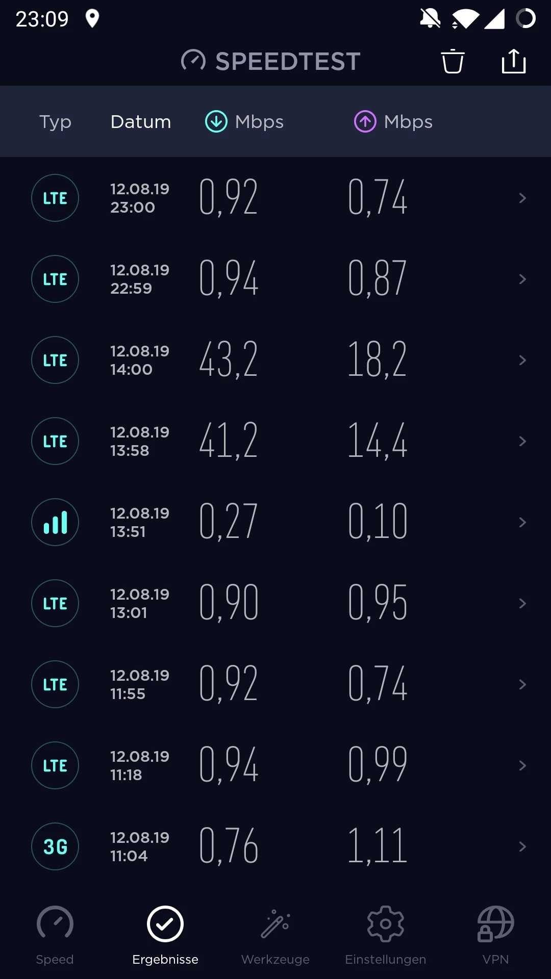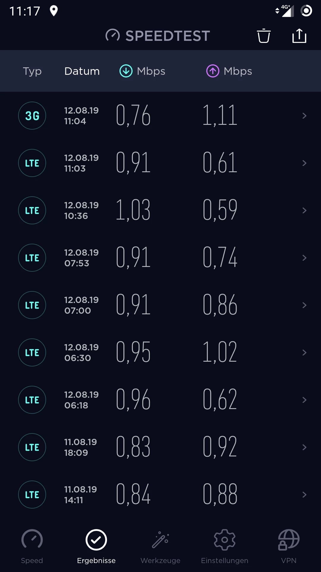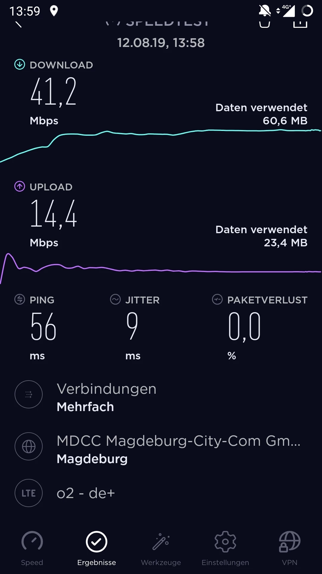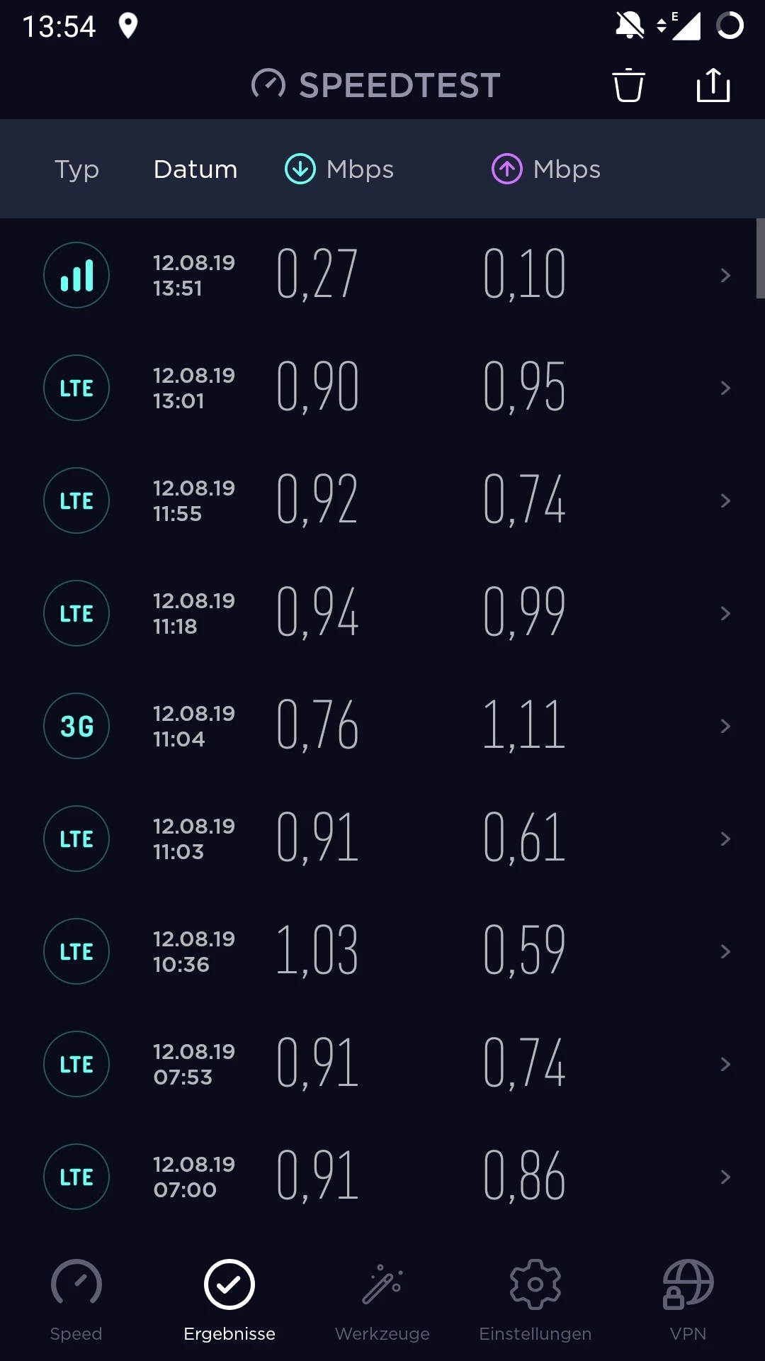 Habe ich getan, keine Veränderung. es pegelt sich bei 0,9 ein. Datenvolumen waren vorher 4 GB. ab 14-15 Uhr habe ich manchmal volle Leistung. Das langsame Internet habe ich an unterschiedlichen Standorten. Ich war schon vor 14.00 Uhr im O2 Shop (vor dem Termin als ich schnelles Internet hatte). Der Mitarbeiter vor Ort hat die geringe Datenleistung gesehen und meinte, dass es wie eine Drosselung scheint. Ich kann aber nicht jeden Tag in den Laden gehen. Speedtest mache ich seit kurzem regelmäßig. Ich schicke noch mal einen screenshot.