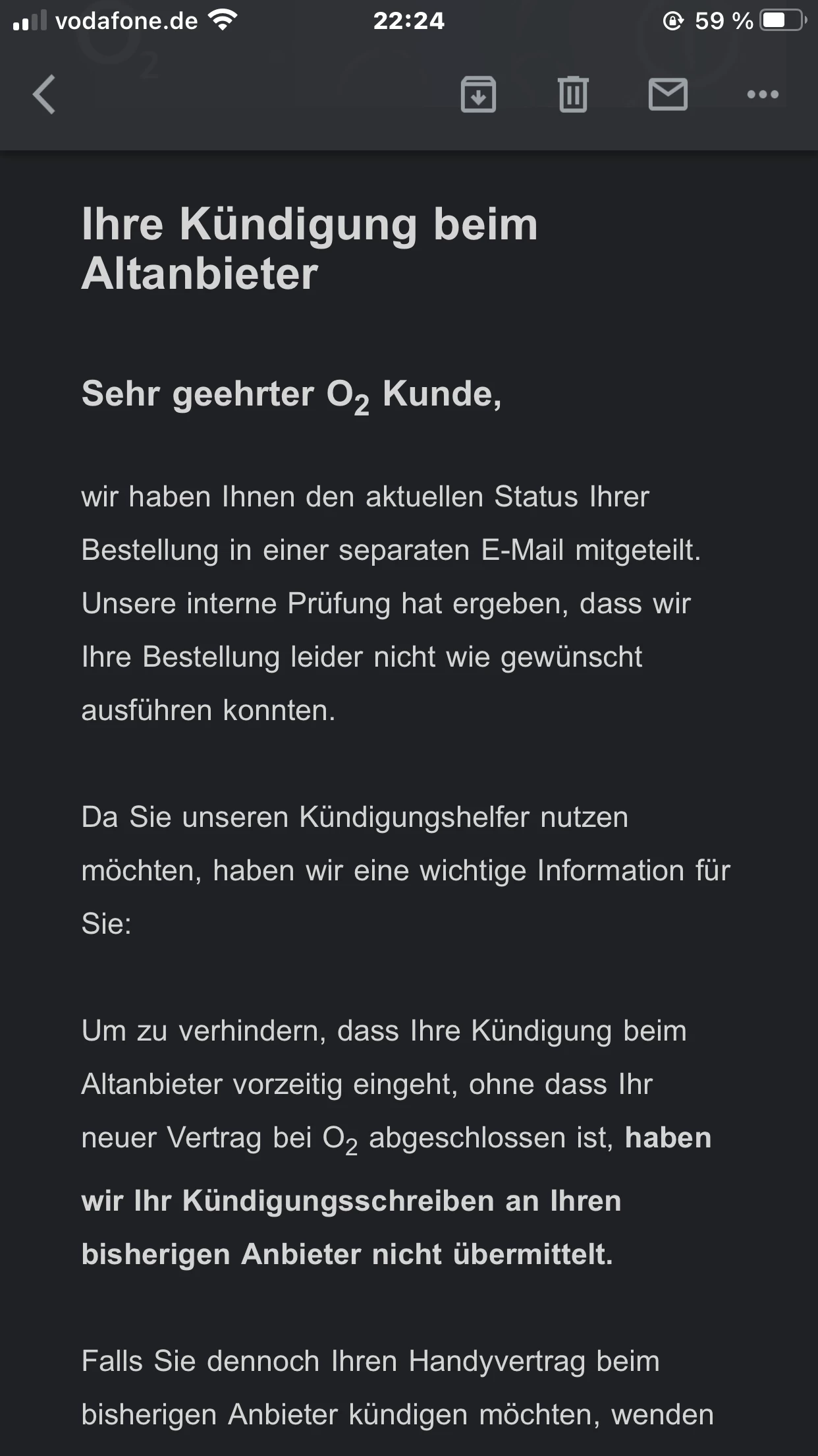 deine Bestellung wurde wahrscheinlich aus Bonitätsgründen abgelehnt. Damit du nicht ohne Mobilfunkanschluß da stehst, hat O₂ die Kündigung beim alten Anbieter nicht eingereicht.
