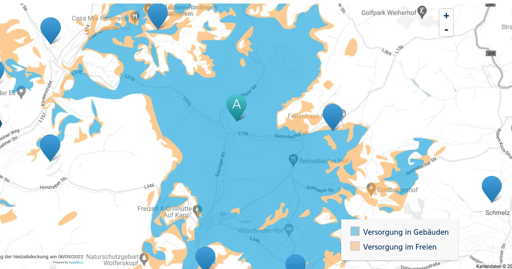 also in diesen Postleitzahlengebiet ist 5G einzig an der Basisstation bei “Hargarten” aktiv. (ich hab diese Station mal mit einen “A” markiert) Die anderen Stationen im Umkreis verfügen über noch keinen 5G Ausbau.