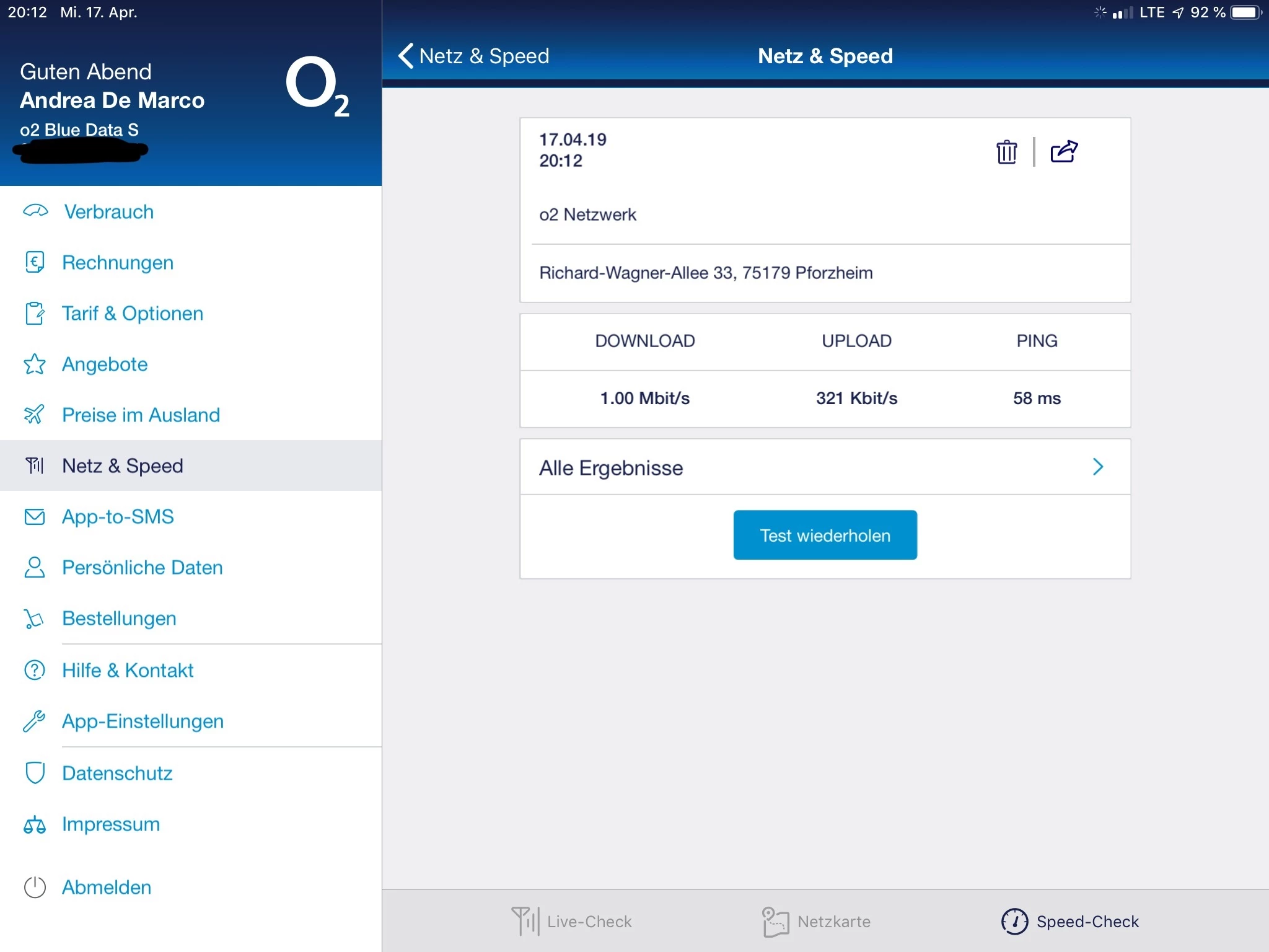 Um auszuschließen, dass es an meinem Gerät/Vertrag liegt, habe ich Speedtests mit meinem iPad (Separater Datenvertrag) und dem Handy meiner Frau (Separater o2-XXL Vertrag über Tarifhaus).