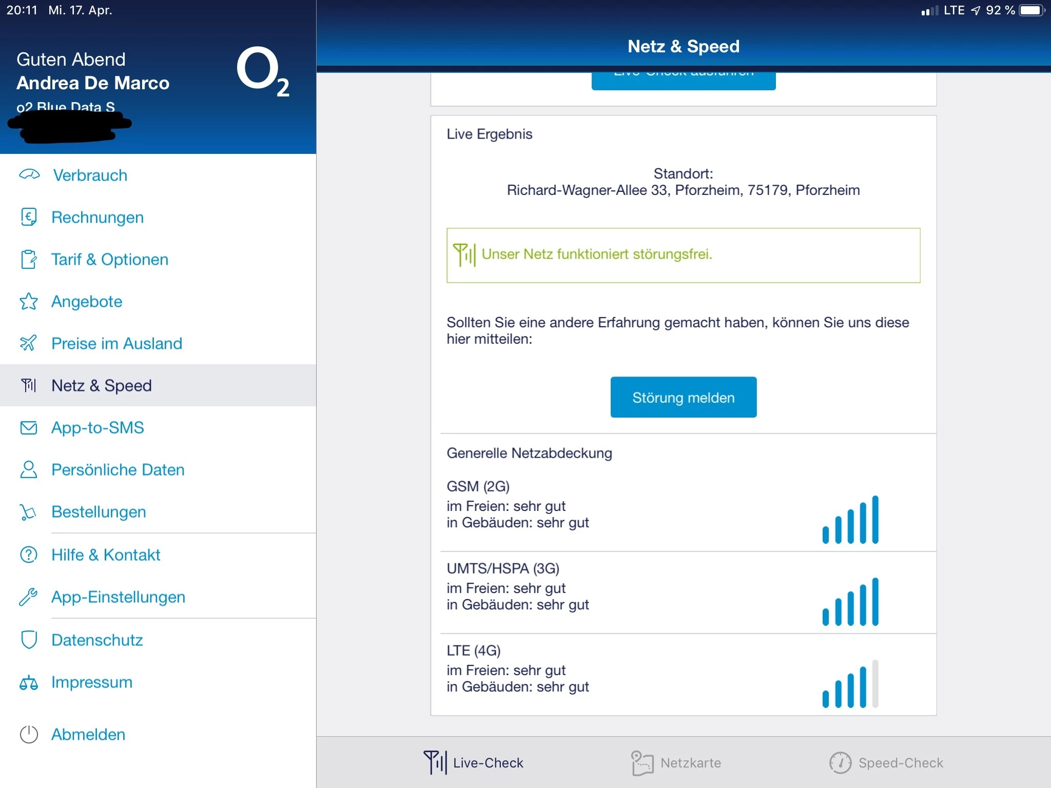 Die Netzcheck App zeigt dagegen einen einwandfreien Empfang und störungsfreien Betrieb der Netzinfrastruktur an.