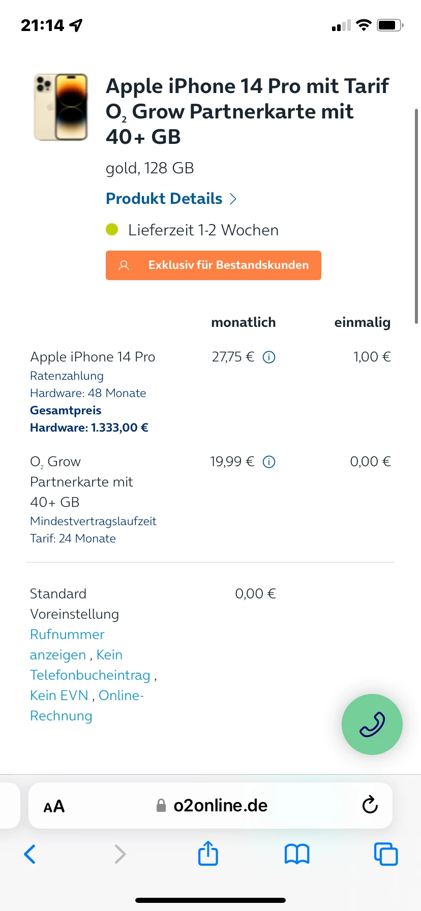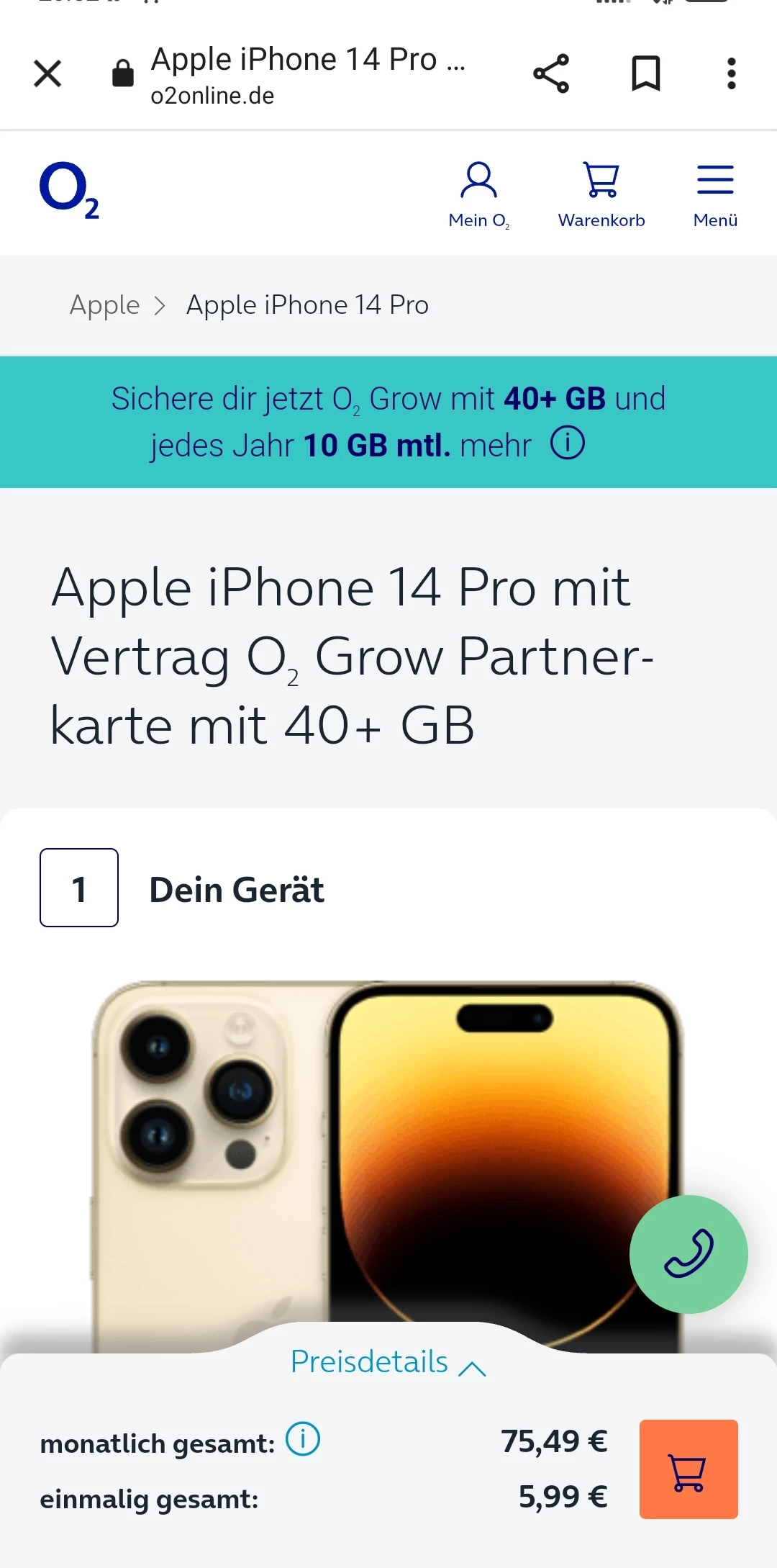 "Das aktuelle Angebot für o2 Kunden liegt mit 40GB + iPhone 14 Pro in Gold mit 128 GB bei 47,74€."