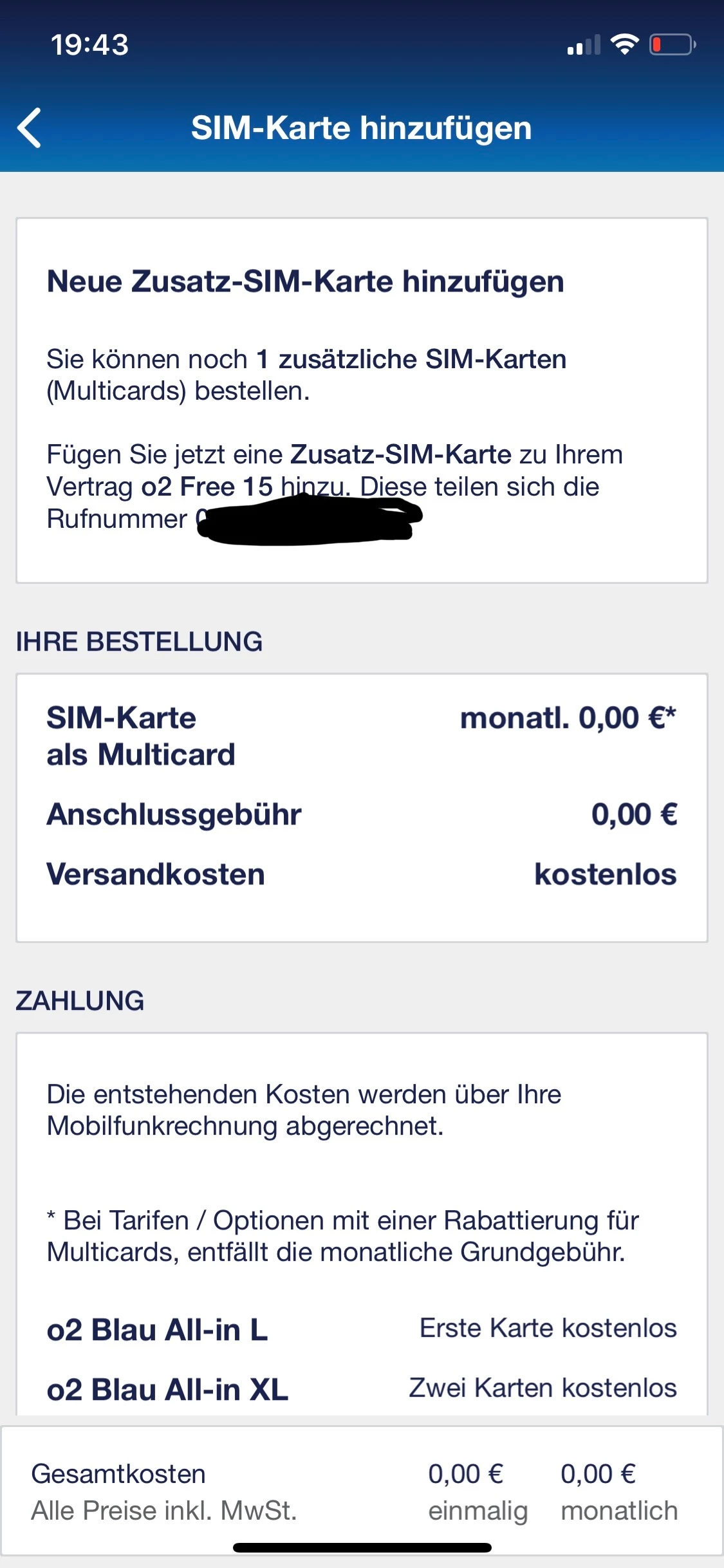 Nun habe ich gesehen das dieser in meinem “Mein O2“ als kostenlos ist, ohne Anschluss oder monatlichen Gebühren. Sofort einen bestellt der in meinem Tarif auch kostenlos aufgelistet war. Nun, mit der aktuellen Rechnung sehe ich das dieser Multicard bis zum Monatsende berechnet wurde und in meinem Tarif wieder mit 4,99€ monatlichen Gebühren aufgelistet ist.