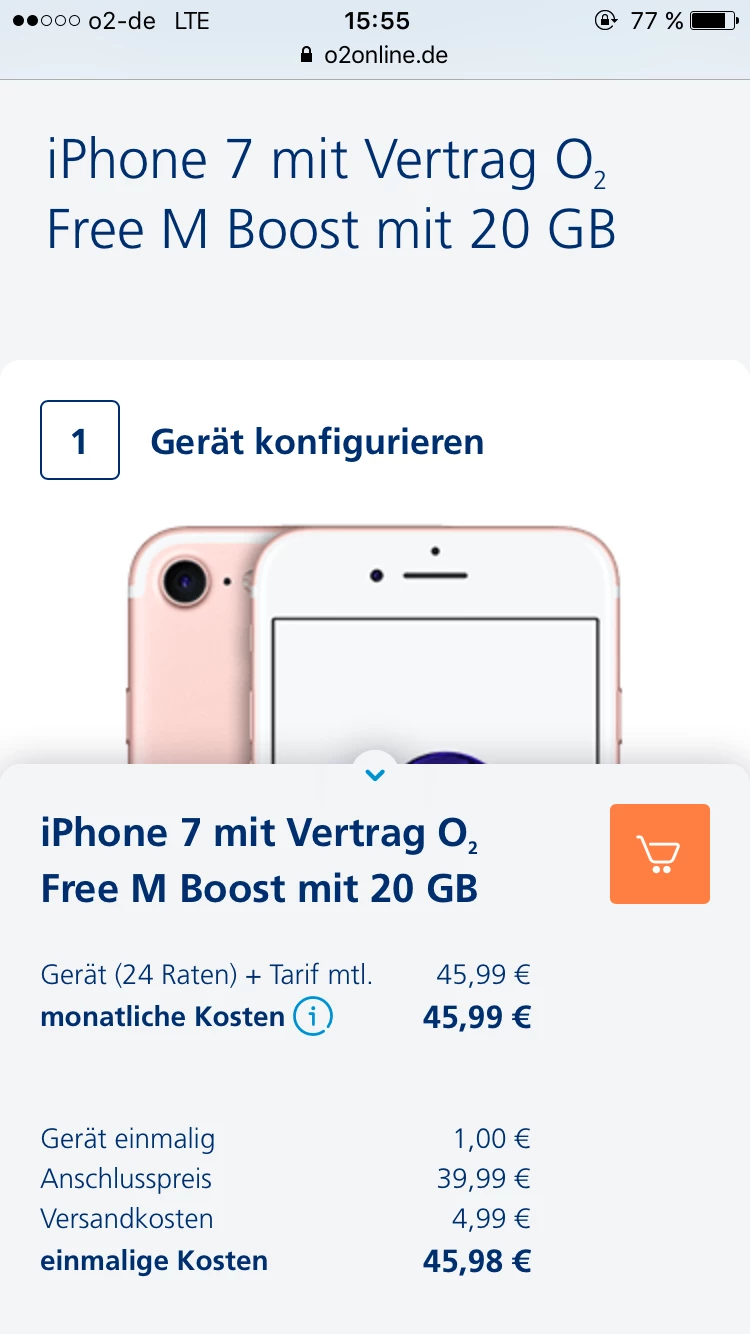 Den o2 Free M Boost + iPhone 7 128 GB kann ich für 49,99 EUR im Monat anbieten.