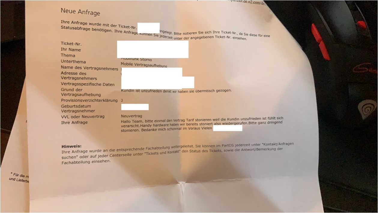 Sie sollten mich bitte auch verstehen, bin schon seit einer Zeit O2 Kunde und habe mehrere Verträge abgeschlossen, bis auf die eine ist alles gut gelaufen..ich denke ich bin an einer Filiale eingetroffen wo ein falscher Mitarbeiter von euch gewesen ist. Das behaupte ich weil er gar nicht Kundenfreundlich war und mir am Ende noch gesagt hat dass es jetzt bei O2 ein neues Pflichpaket gebe, und ich müsste eine 10€ Versicherung für das Handy monatlich zahlen obwohl ich sowas gar nicht gebrauchen könnte und auch nicht am Anfang drauf angesprochen worden bin. Sie können ja alles nachprüfen anhand der Zeiten, nach 15 Minuten nachdem wir den Vertrag abgeschlossen haben, bin ich zurück in der Filiale gewesen und habe gemeldet dass ich alles kündigen möcht weil der Vertrag nicht meiner Wünschen entspricht (diesbezügliche bin ich natürlich in einer anderen Filiale von euch gewesen, wo mich ein sehr hilfsbereiter und netter Mitarbeiter beraten hat, der mir auch erklärt hat dass dies was passiert ist für O2 ein absolutes NO GO wäre..und dass angebliche "Pflichtversicherung" für's Handy gat nicht existiert).
