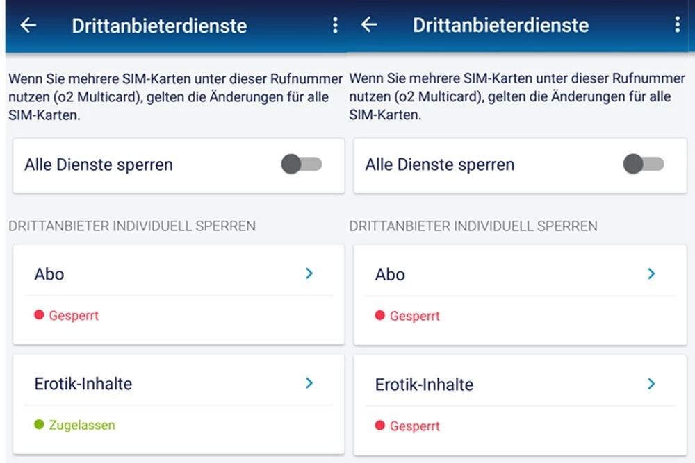 Drittanbietersperre bei o2 einrichten: Mehrwertdienste sperren.