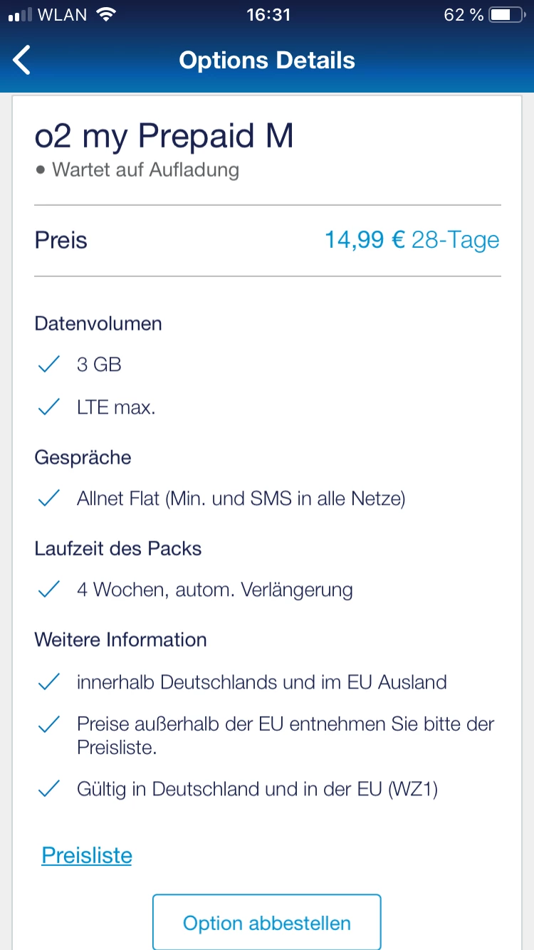 Sollte so passen denke ich. Habe gerade die Möglichkeit gefunden, die Option, die anscheinend auf Aufladung wartet, abzubestellen. Sollte ich sie abbestellen und nochmal neu buchen? Mir kann ja nicht doppelt Geld abgebucht werden, also sollte ich es mal probieren?
